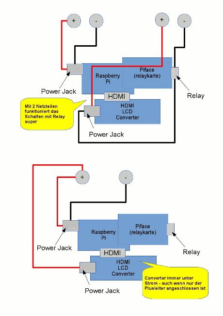 Hallo, ich habe folgendes Anfängerproblem ... Setup: 1 Netzteil, 1 Raspberry, 1 HDMI Converter Mit dem Netzteil versorge ich gleichzeitig Raspberry als auch HDMI Converter. (beides 5V) Die Spannungsversorgung für den HDMI Converter soll an/aus schaltbar sein. Problem ist jetzt, dass der HDMI Converter auch bereits unter Spannung steht, wenn ich Ground noch gar nicht angeschlossen habe. Irgendwie führt die bestehende HDMI-Verbindung also geräteübergreifend zurück zu Ground! Nutze is jeweils ein eigenständiges Netzteil funktioniert es. Anbei mal eine Skizze dazu ... Die Piface-Karte die auf der Skizze mit drauf ist, ist da der Vollständigkeit halber mit drauf. Sollte aber mit dem Problem nichts zu tun haben. Jetzt meine Frage ... Wie trenne ich die Stromkreise am Besten?