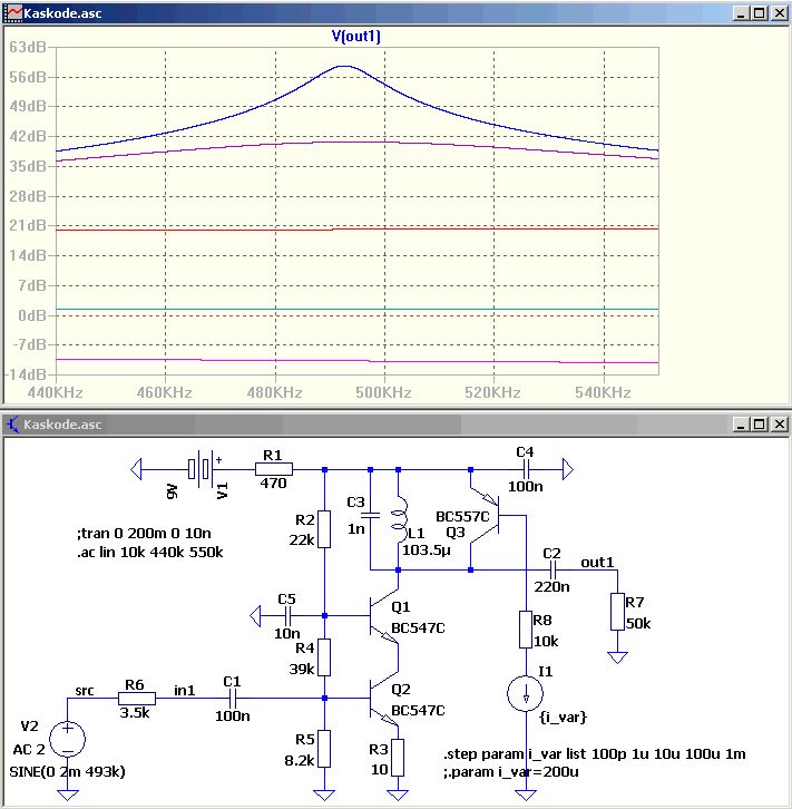 Hallo Bernhard Ja einen ZF Verstärker für 489kHz die 489 Khz sind vorgegeben von meinem Laddefilter der mit 500kHz Resonatoren arbeitet. Da mein Ladderfilter eine Impedanz von 1,5 kOhm hat ist der Kollektorwiederstand von 1,5 kOhm halt zwingend ( Spule oder RC Schwingkreis im Kollektor dürfte also ausscheiden, außer ich würde sie mit 1.5kOhm bedämpfen. ) Es sollte auch nur eine Prinziepschaltung sein, mehre Stufen sind besser das ist klar. tschüss Peter