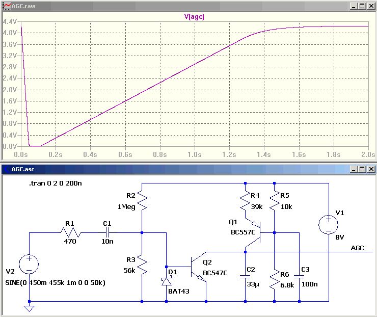 Hallo Peter Hier ist noch eine Simulation eines Gleichrichters für die AGC. Das schöne an der Schaltung, es läßt sich alles einzeln einstellen: 1. R5 und R6 bestimmen die Emitterspannung und damit auch die max. AGC-Spannung am Kollektor. Der Kollektor kann nicht weiter ansteigen als der Emitter. 2. Q1 stellt eine Stromquelle dar, der Strom kann mit R4 eingestellt werden. Der Strom (ca. 100µA) und C2 bestimmen die Release-Time. 3. Die Ansprechschwelle des Gleichrichters wird durch R2 und R3 bestimmt. Jedoch sollte der Ruhestrom des Q2 ohne Signal kleiner sein, als derjenige der Stromquelle, also etwas unterhalb von 0,6 Volt bleiben. 4. R1 und das Hfe von Q2 bestimmen die Attack-Time. Bei Signalen > 1 Vss hilft D1 mit und die Attack-Time wird noch wesentlich kürzer. Die AGC-Spannung kann dann in 5 ms Null Volt erreichen, das schützt die Ohren. Die mit der AGC geregelte Stufen würde ich nur nach dem Quarzfilter wirken lassen, denn die Einschwingzeit des Quarzfilters macht die Regelung deutlich schwieriger. Gruß, Bernd