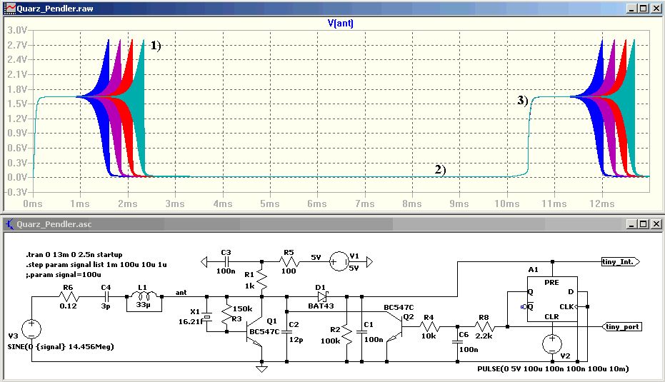 Hallo m.g. > Bei einer 1m Antenne komme ich gut 4m. > Aber ich würde hier lieber die Sendeleistung erhöhen! Dann müßtest Du die Leistung auf 1 Watt erhöhen, ein Wert, mit dem man bei guten Bedingungen schon durch halb Europa kommt. Ganz abgesehen vom Stromverbrauch. Die kurze Antenne strahlt nur ca. 1/100 der Energie ab. Eine Drossel bringt die Antenne in Resonanz und verbessert damit das Signal um 10 dB, das ist die 10 fache Leistung. Wird das beim Sender und beim Empfänger gemacht, entspricht das schon 20 dB bzw. der 100 fachen Leistung. > Das klappt sehr gut, aber eben nur auf sehr geringe Entfernung. Beim Empfänger gibt es sicherlich noch einiges an Potenzial. - Der Oszillator sollte so früh wie möglich gestoppt werden (1), damit der Quarz nicht bis zu vollen Amplitude aufschwingt. Je größer die Amplitude, desto länger braucht der Quarz, um sich wieder zu beruhigen. - Der Quarz muss genügend Zeit haben (2), um auf einen Wert kleiner als die aktuelle Antennenspannung auszuschwingen. Wenn er aktiv bedämpft wird, reduziert sich die Zeit etwas. Bei der Simulation dauert es pro Zehnerpotenz ca. 1,2 ms. Von 1 Volt bis 1µV sind es 6 Zehnerpotenzen. Um also 1µV detektieren zu können, muss mindestens >7.2 ms gewartet werden. - Die Startflanke (3) sollte so sanft wie möglich schalten, damit der Quarz dabei nicht zum Schwingen angeregt wird. Deshalb hab ich dieses Signal mit C6 und R8 abgerundet. Ohne diese Maßnahmen reduziert sich die Empfindlichkeit auf >100 µV. Wird die Antenne am Quarz angeschlossen, wirkt dieser als Filter und es werden kaum Oberwellen abgestrahlt. Bei einem zusätzlichen Verstärker muss ein Tiefpassfilter nachgeschaltet werden, um die zwangsläufig entstehenden Oberwellen wieder zu entfernen. Gruß, Bernd