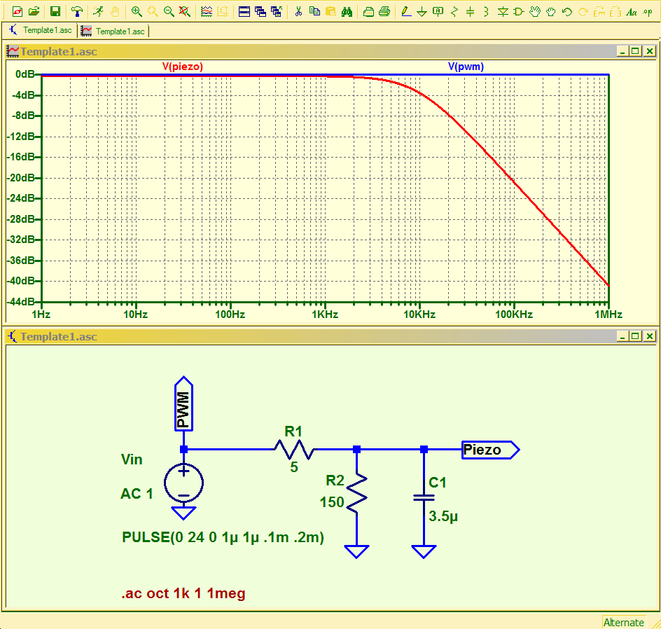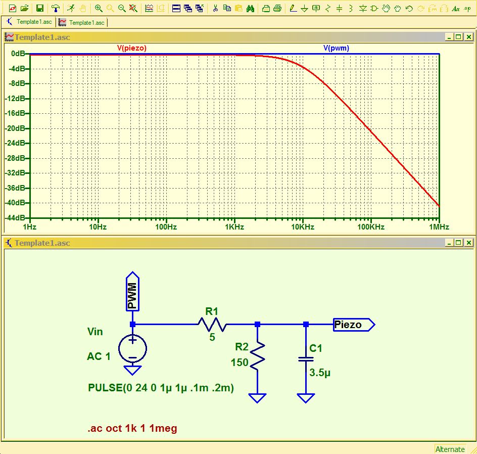 Sieht man von den mechanischen Einflüssen ab, so verhält sich ein Piezo in ertser Näherung wie ein Kondensator. Am besten unterscheidet man daher den DC und den AC Fall. DC: Die Keramik des Piezos ist typischer Weise nicht leitend und kann daher vernachlässigt werden. Am Piezo liegt also die duch den Spannungsteiler 5Ohm / 150Ohm vorgegeben Spannung an. Der fliessende Strom ist durch Uein / 155Ohm gegeben. AC: Aus Wechselstromsicht liegen die 5 und 150Ohm parallel (=4.83Ohm) und bilden mit den 3.5µF des Piezos einen RC-Tiefpass mit einer Grenzfrequenz von 9.4kHz. D.h. weit unterhalb (z.B. deine 100Hz) folgt die AC-Spannung am Piezo deiner Eingangsspannung, weit oberhalb siehst du nur noch den Mittelwert (z.B. bei 100kHz hast du nur noch 1/10 der Eingangsamplitude) Wenn man nicht rechnen will, simuliert man halt einfach... (siehe Anhang)