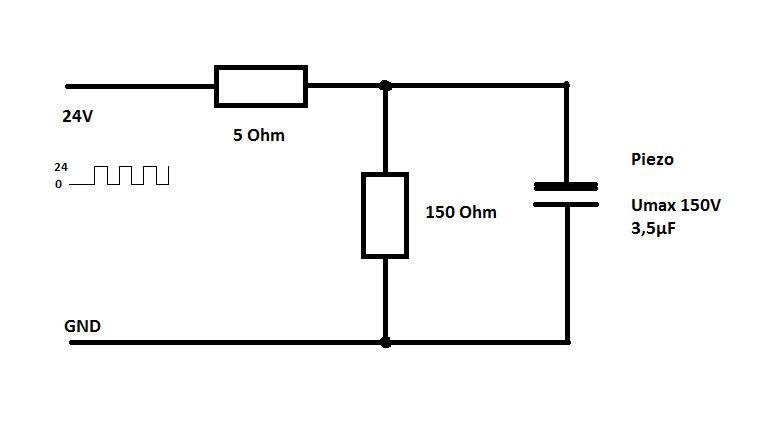 Hi, vorweg, ich bin kein Elektroniker. Ich will wissen mit welcher Spannung der Piezo in der angehängten Schaltung betrieben wird. Wie rechnet man das am geschicktesten? Der Piezo ist ja eigentlich wie ein Kondensator... aber betrieben wird das gante mit einer pulsierenden Gleichspannung (Rechteck, Dreieck oder Sinus) von 100Hz Hat der Piezo dann einen Blindwiderstand? Oder einfach ein unendlich hohen Widerstand? Also wie kann ich die Spannung errechnen, mit dem der Piezo betrieben wird? Einfach mit 24V/155Ohm (U/Rges) und dann die Spannung, die am ersten Widerstand abfällt? Oder ist das komplizierter?