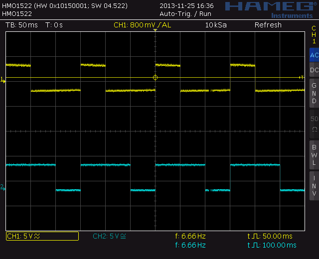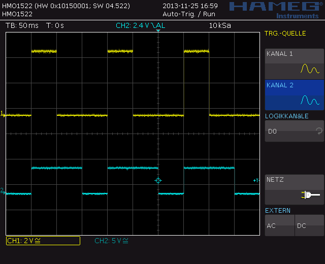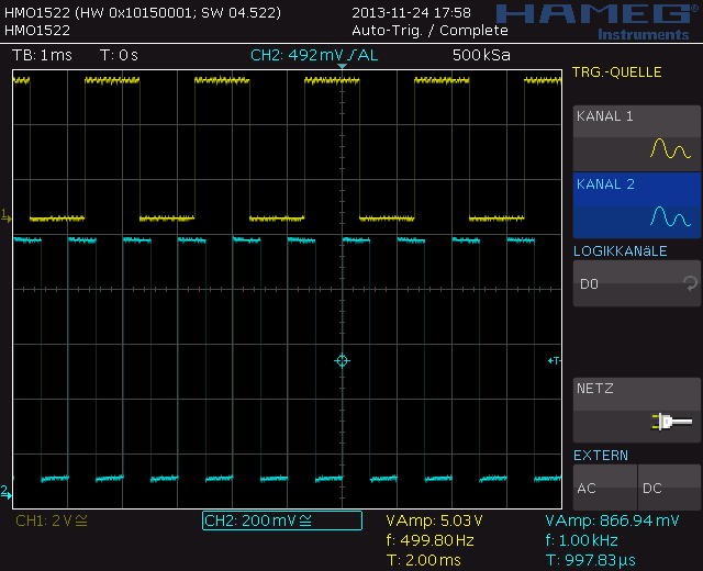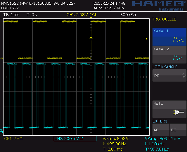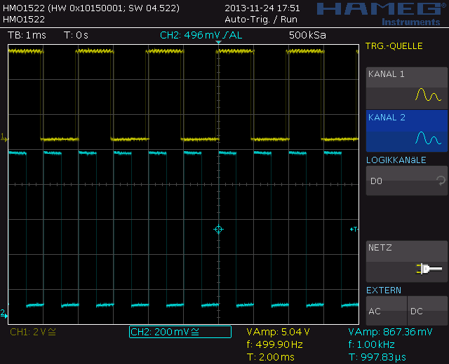 warum können Oszilloskope immer nur auf einer Quelle Triggern. In den Anhängen ist entweder Kanal 1 oder Kanal 2 deutlich zu erkennen. Wenn ich auf Stopp drücke hätte ich gerne beide Kanäle irgendwie auch synchronisiert. z.B.: beide auf einer steigenden Flanke. Kanal1 kommt von einem AVR mit 500Hz. Kanal 2 ist das interne 1kHz Signal.