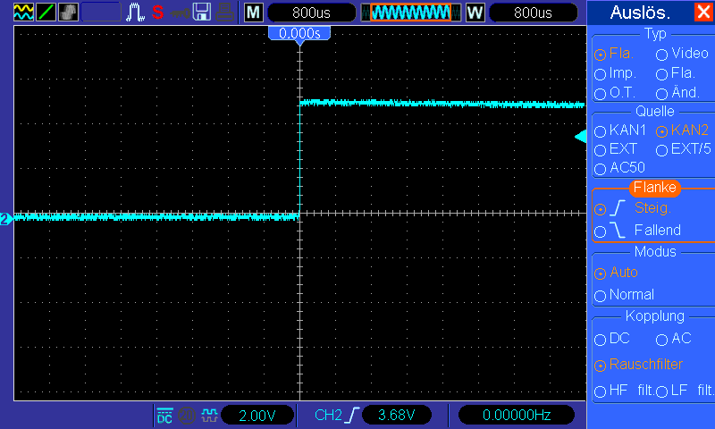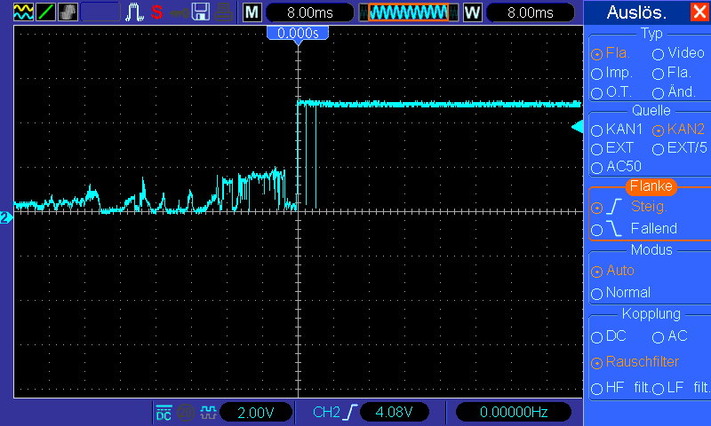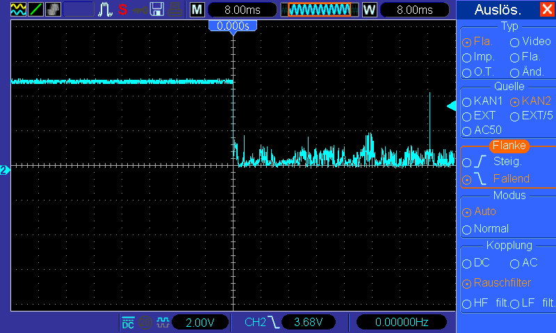 Roland ... schrieb: > Hast Du auch ein Bild dass das Öffnen dieses Tasteres zeigt? Wäre jetzt > interessant, ob dieser auch beim Öfnnen nicht Prellt. Er prellt entweder garnicht, oder liefert einen Spike im µs-Bereich, um dann voll zu öffnen. ABER: die Beispielbilder, die hier zu sehen sind, sollen niemanden dazu verleiten, auf eine gute Entprellung zu verzichten. Es kommt immer auf die Qualität der Taster an, die verwendet werden. Die von mir bevorzugten Digitast haben zum einen vergoldete Kontakte und einen Springkontakt mit Feder und liegen preislich in einem vertretbaren Rahmen. An anderer Stelle hatte ich Erfahrungswerte zu Tastern beschrieben: Beitrag "Re: EIN-AUS mit Taster per Interrupt, ATtiny25 o.ä." Speziell mit diesem Taster http://www.reichelt.de/Drucktaster-Druckschalter/RAFI-107-507/3/index.html?&ACTION=3&LA=2&ARTICLE=110864&GROUPID=3277&artnr=RAFI+107.507 habe ich noch Bilder gemacht, die dessen reduzierte Qualität verdeutlichen. Es gibt gute und schlechte Schaltvorgänge; ich zeige hier die schlechten Schaltvorgänge, die statt Prellen eher 'Schaltrauschen' zeigen. Ein 'aktives RC-Glied' wird mit diesem Signal aber gut fertig. Man sollte sich seine Taster immer genau aussuchen und alles vermeiden, was nach 'Zusammendrücken von Weidezaundrähten' aussieht.