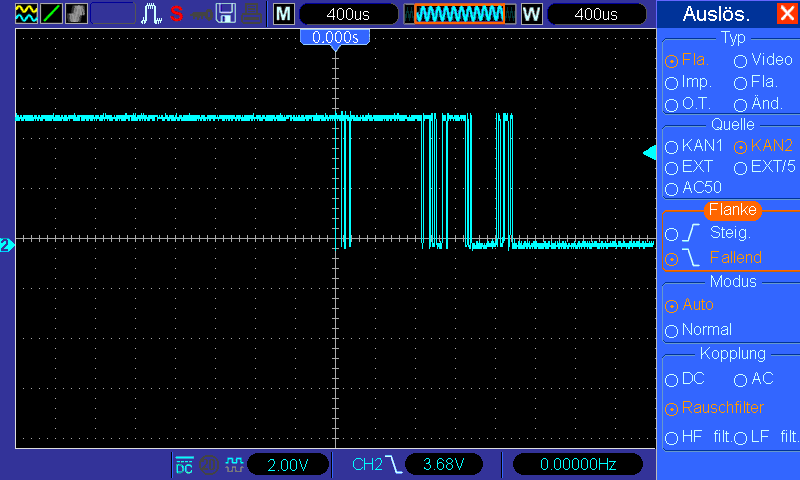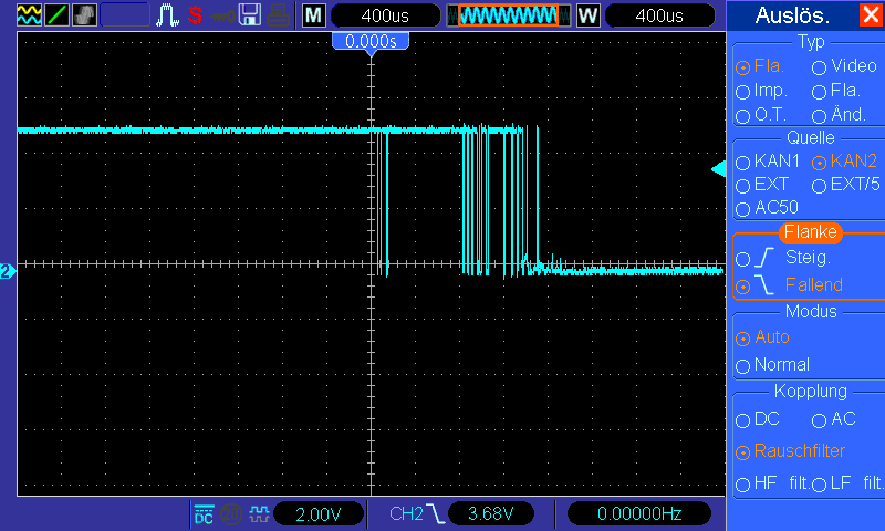 Und noch Bilder eines alten Installationstasters von Berker beim Schliessen. Der Zeitmaßstab ist 400µs, um die schnelleren Preller deutlich zu machen. Soll Jeder selbst entscheiden, was von den immer wiederholten Pauschalaussagen zum Prellverhalten von Tastern zu halten ist.