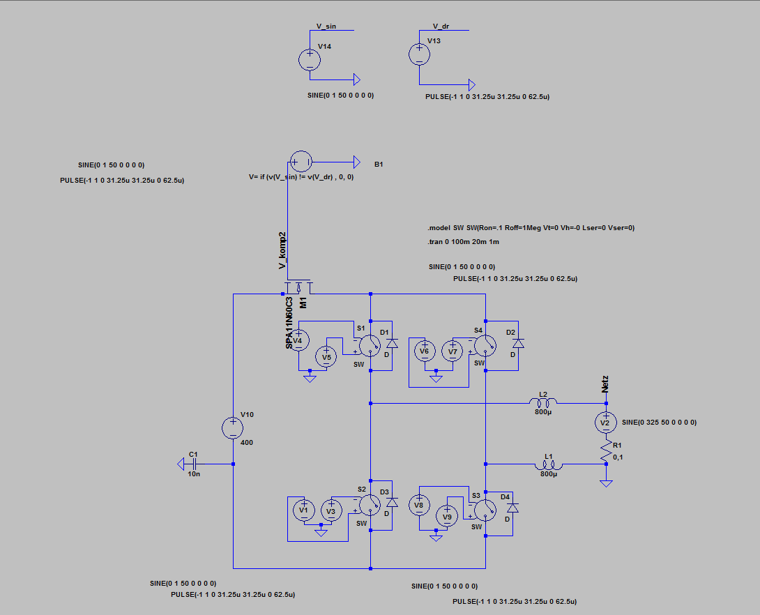 Hallo, ich versuche momentan den H5 WR mit ltspcie zu simulieren. Bis jetzt verwende ich ideale Schalter. Der 5 Schalter soll genau dann auf OFF schalten, wenn Sinus = dreieck ist.(siehe Anhang) Wie kann man mit ltpsice zwei Signale so vergleichen, dass der Schalter nur aus geht wenn beide Signale gleich sind? Viele Grüße