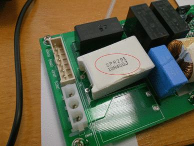 Ein 10W Drahtwiderstand von 40 Ohm, vermutlich so wie dieser http://www.vishay.com/docs/31819/mrwxr.pdf bloss mit längeren Anschlussdrähten, verbaut auf einer paltine, auf der eigentlich 2 SCK current inrush limiter NTC montiert sein sollten (TH1 und TH2) was aber wohl wegen Fehldesign dann gegen den 40 Ohm Festwiderstand ersetzt wurde. Kaputt geht er auch dann, wenn beim Schaltnetzteil der Schalttransistor durchlegiert.