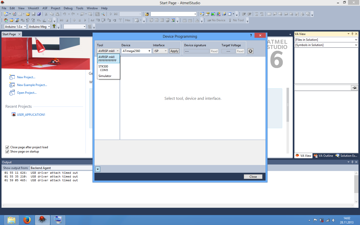 Hallo, ich habe ein Arduino Mega 2560 und würde dieses aber gerne mit dem AVRStudio programmieren. Jetzt habe ich noch einen AVR ISP MK2 und auf dem Board sind auch schon Stiftleisten dafür herausgeführt, also würde ich das Board gerne mit dem programmieren. Hab Windows 8.0 und das AVR Studio 6.1.2730 Wenn ich alles anschließe und im AVRStudio auf Device Programming gehe wird der ISP MK2 zwar angezeigt, ich kann aber keine Verbindung zum Board aufbauen.Der ISP MK2 ist richtig an das Board angeschlossen. Im Bild seht ihr das ganze mal. Hoffe mir kann jemand helfen. Gruß