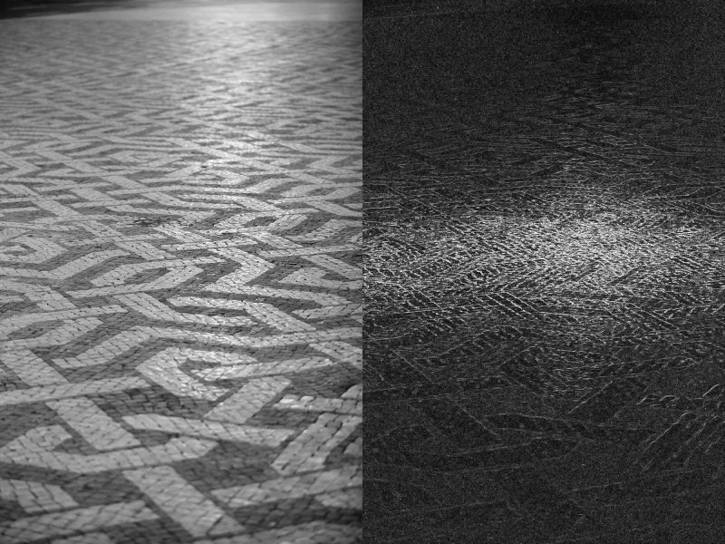Ich möchte den Hochpassgedanken von oben nochmal aufgreifen: Von dem Videosignal den Farbhilfsträger entfernen und dieses durch einen Hochpass mit anschliessender Gleichrichtung und 'Siebung' schicken. Aus dem ursprünglichen Videosignal die Sync-Signale zurückgewinnen und dem neuen Signal hinzufügen. Das gedachte Ergebnis ist ein Videosignal, welches an den Stellen hell ist, wo das Bild scharf ist, Du also sehen kannst, an welcher Stelle scharf gestellt ist. Das Ergebnis dürfte ein ähnliches sein, wie man bei der Funktion "Kanten finden" bei vielen Grafikprogrammen erhält. Beispiel hängt an. Edit: Ach ja: links das Bild, rechts das Ergebnis. Gruß Jobst