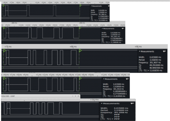 Hallo Forum, hier die Sonntagsfrage ;) Anbei das Protokoll, wie das User-Interface eines Philips Wake-Up-Light das Board das die Lampe ansteuert, "bedient". Die Graphen bedeuten in dieser Reihenfolge: - Off - 9 - 10 - 11 - 1 Was ich sonst noch dazu sagen kann: - Jeder Frame ist wohl 11,6 ms lang - Das kleinste Symbol scheint 0,415 ms lang zu sein Erkennt hier jemand ein bekanntes Protokoll? Hintergrund: Die Leistungs-Elektronik um die Lampe anzusteuern ist kaputt. Ich würde sie gerne durch was eigenes ersetzen und einfach das User-Interface (mit Radio, Uhr etc) übernehmen. Danke schon mal für Input! Max