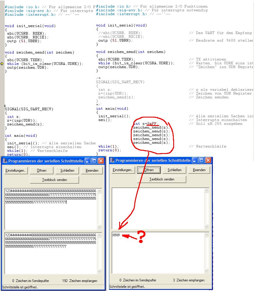 Hallo, Ich verwende dieses Beispiel-Programm (Anhang), um mit dem AVR über den UART komunizieren zu können (senden und empfangen). Wenn ich jetzt aber nur senden möchte, ich habe das Original leicht abgeändert, schreibt Hyperterminal nur Schrott (siehe Anhang, Bild rechts). Das Bild links zeigt, dass die Hardware, Baudrate.. in ordung ist. Es muss also an "meiner" Code liegen, aber nur wo, dass ist hier die Frage? Danke schon im Vorraus Zoltan