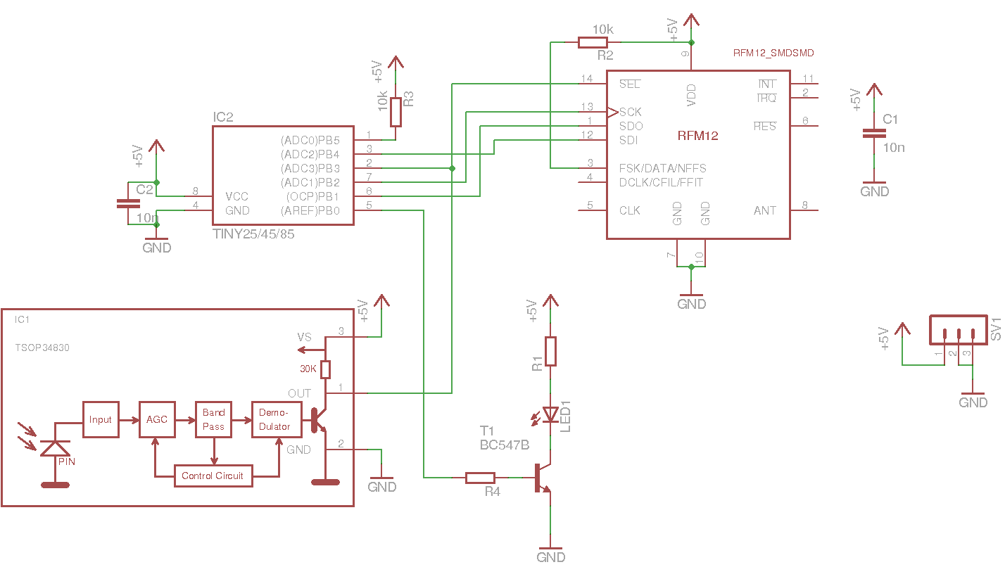 Was mir noch eingefallen ist: Wegen der Pinknappheit des Tiny muss ich einen Pin vom RFM12 für den TSOP doppelt benutzen. Jetzt hab ich ja den NSEL-Anschluss dafür genommen, wobei ich dann bei IR-Empfang die SCK-Leitung des RFM12 konstant auf GND lasse. Oder ist es besser, die SCK-Leitung dafür zu nehmen und umgekehrt NSEL bei IR-Empfang auf high zu ziehen? Der Ausgang des TSOP hat ja anscheinend einen eingebauten Pull-Up.