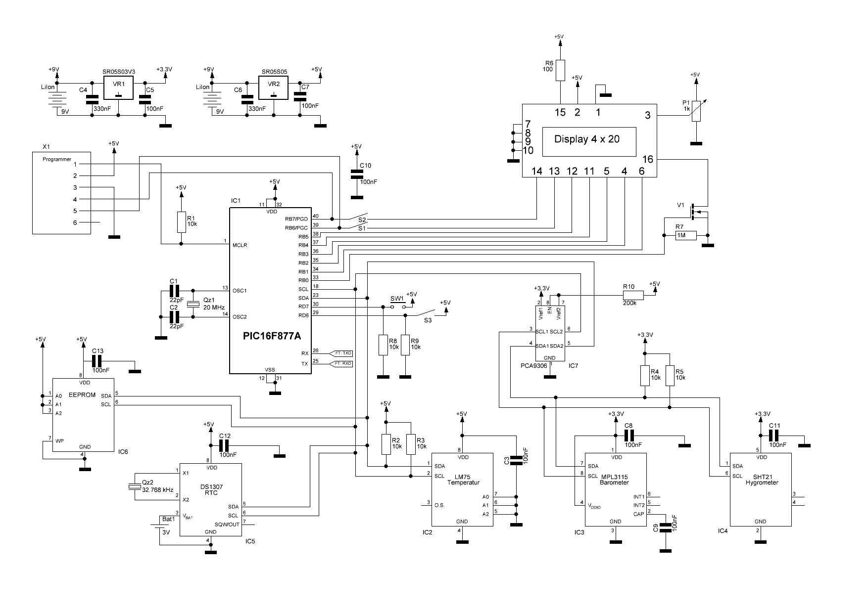 Tach Arbeite am Bau einer Wetterstation mit dem PIC16F877A. Ich will 3 Sensoren (Temperatur,Feuchte,Druck) mit I2C auslesen und dann über die I/0 Pins auf dem LCD ausgeben. Ein einfaches Programm, welches etwas auf das Display schreibt funktioniert. Doch sobald der I2C-Startbefehl ausgeführt wird, geht nichts mehr. An was kann das liegen? Display ist ein 20x4 mit HD44780 Controller lg