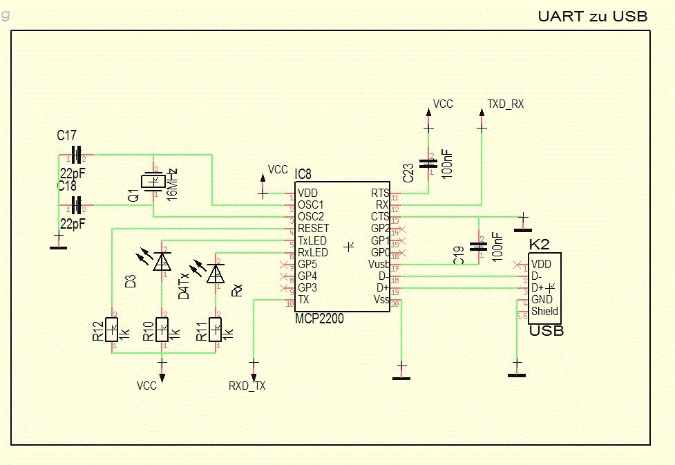 Hallo Leute, Ich mache aktuell für die Hochschule ein Projekt und habe eine MCP2200 als schnittstelle uC -> Windows PC verbaut. Leider bekomme ich beim Anschluss an den PC immer nur das Problem: USB-Gerät wurde nicht erkannt. Im Anhang findet Ihr meine Schaltung. VCC = +5V RXD_TX = kommt vom uC von RXD und geht an TX am mcp TXD_RX = kommt vom uC von TXD und geht an RX am mcp zwischen den Anschluss VDD und Masse habe ich mittlerweile auch schon provisorisch nen 100nF gebastelt, was aber keine Besserung brachte. Anstelle des 16MHz Quarzes sitzt ein 12MHz drinnen. Die Beschriftung ist nur noch nicht Korrekt. Der Rest ist genau wie im Schaltplan verbaut. Ale Widerstände und Kondensatoren als SMD1206. Ich bin um jeden Tip dankbar, woran es liegen könnte. Steph