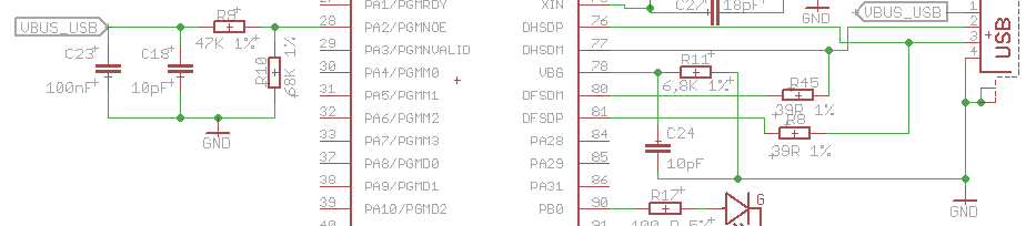 Hallo, ich benutze den Controller ATSAM3U2CA-AU und versuche über Full-Speed den Controller als HID anzumelden leider klappt es nicht es wird gar nichts erkannt. Die Software ist höchstwahrscheinlich nicht das Problem da Sie beim Evolutionboard läuft. Mein Controller ATSAM3U2CA-AU läuft grundsätzlich auch ich kann auf ihn zugreifen, flashen leds ansteuern etc.. Aber das Anmelden als HID funktioniert nicht ich habe die USB-Beschaltung aus dem Datenblatt übernommen. Kann einer mal bitte drüber schauen ob ich irgendwo ein Hardware bug habe. Ich habe schon die Spannung gemessen am Spannungsteiler R9 & R10 liegen ca. 3.3 V an die auf PA2 gehen ( erkennung ob sich der Controller als HID angemeldet hat) Leider habe ich nicht rausgefunden was für eine Spannung am pin VBG anliegen muss bei mir ist sie bei ca. 0V. Weiß einer was für eine Bias Referenzspannung da anliegen muss und wo von ist die anhängig da Sie ja nur intern erzeugt wird wenn ich das richtig sehe?! Hat vllt noch eine Idee was bzw wo ich messen sollte um einen Hardwarebug auszuschließen. P.S Die VDDIO Spannung ist bei 3,3 V und die VDDCORE bei 1,8V. Muss ich vllt noch irgendwas unbedingt aktivieren um auf die USB-Schnittstelle als Full-Speed zu zugreifen zu können? Danke für alle Tips!!!