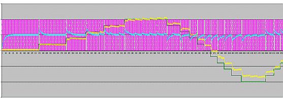 Ich stehe etwas auf dem Schlauch, bzw habe irgendeine Verständnislücke: Wenn ein analoges Signal mit einem Sigma-Delta-Wandler in Pulsweiten/Pulsdichten umgesetzt wird, dann habe ich (in einer einfachen Betrachtung) für den Fall eines zu geringen Ausgangssignals eine 1- und für ein zu hohes Ausgangssignal eine 0 (oder -1). Damit bekomme ich für Signale >0 in der PDM automatisch Phasen >50%, die bei der anschließenden Filterung einen entsprechenden Wert erzeugen. Dieser ist dann wieder proportional dem Eingang. Bislang habe ich mir über die Repräsentation dieses Signals keine grossen Gedanken gemacht, sodern einfach immer gefiltert, bzw. dezimiert. Bei Verwendung eines klassischen CIR verwende ich dabei unwillkürlich eine Integrations- und eine Differentationsstufe. Das entstehende Signal ist also ein gleitender, gefilterter Mittelwert der PDW. Soweit mein Verständnis. Nun habe ich ein Interpretationsproblem, weil das PWM-Signal ja ein differenziertes Signal darstellt, da es bei der Wandlung auf dem kontunierlichen Vergleich zwischen Soll und Ist beruht. Müsste man dieses nicht mit einem Integrator behandeln? Ich habe das nämlich testweise mit einem Excel-Diagram durchgerechnet und bekomme für das PDM-Signal anscheinend in der Tat ein Verhalten in der Art eines Differenziators, das ich integrieren muss. Konkret nehme ich in der Spalte den alten Wert und addiere die 1 oder -1 des PDM-Signals drauf. (gelbe Kurve) Eine reine Filterung (90% alter Wert + 10% PDM-Signal) ohne vollen Integralanteil zeigt Hochpassverhalten. (türkise Kurve). Die grüne Kurve ist ein stufenförmiger Sinus, also mit Rechtecken. Dieses muss rekonstruiert werden. Wo ist mein Interpretationsfehler? Ist das PWM- (PDM-)Signal nun ein differenziertes Signal oder doch ein vollständiges Signal auf Proportionalebene? Für einen reinen Sinus ist es egal, weil sich so oder so wieder ein Sinus ergibt. Speise ich aber ein Rechteck ein, kommt nach der Filterung keines mehr raus. Der entstehende Sinus hat 90 Grad Verschiebung.