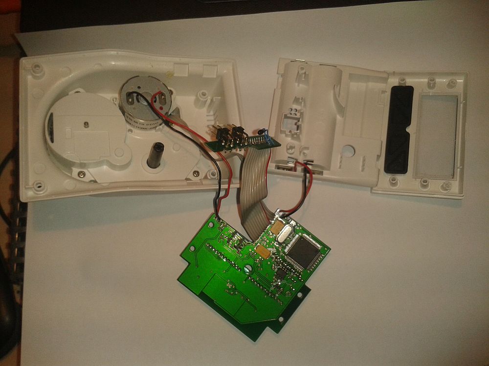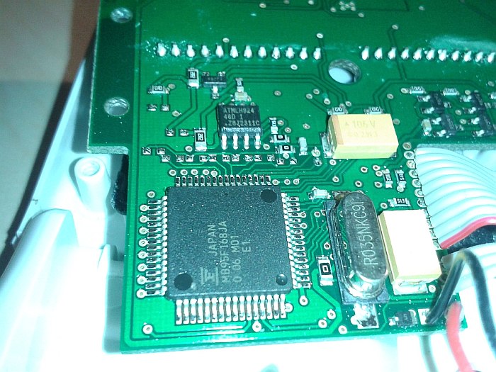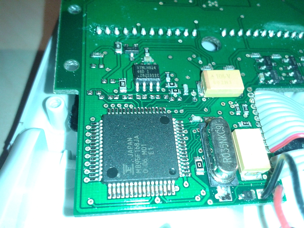 Hallo Foren-Gemeinde! Ich beschäftige mich zur Zeit mit dem Conrad Heizkörperregler HSA9001A. Nach Suche im Netz konnte ich leider keine Hardware Infos zu dem Regler finden. Ziel ist die Einstellung der Soll-Temperatur per Funk (RF-433MHZ). Meine Erkenntnisse bis jetzt: Controller: MB95F168JA von Fujitsu (Datasheet: http://pdf.datasheetarchive.com/indexerfiles/Datasheets-IS13/DSA00248000.pdf) Hinter dem Batteriefach ist eine Stiftleiste herausgeführt, was mich natürlich direkt an den Honeywell HR20 erinnerte. Pin-Belegung: 4er Block nahe dem Plus-Pol der unteren Batterie (Draufsicht): | 1 2 | | 3 4 | 4er Block nahe dem Minus-Pol (Draufsicht): | 5 6 | | 7 8 | 1... ???? 2... ???? 3... GND (Pin 16 + Pin 64) 4... UART out (Pin 6) 5... RST (Pin 21) 6... VCC (Pin 1 + Pin 17 + Pin 22) 7... MOD (Pin 13) 8... Trigger-In?? (Pin 4) EEPROM: ATML H924 (Datasheet: http://www.atmel.com/Images/doc0180.pdf) An dem UART Ausgang habe ich schon mit verschiedenen Baud Raten gelauscht, konnte aber keine Ausgabe feststellen. Meine Idee war nun den EEPROM mit einem weiteren Mikrocontroller zu bearbeiten, um so die Temperatur einzustellen. Auch die Betätigung der Taster per Mikrocontroller wäre denkbar. Vielleicht hat hier ja jemand Lust mitzuarbeiten oder hat selbst schon eigene Erkenntnisse erlangen können! Viele Grüße! Edit: Habe noch 2 (leider ziemlich schäbige) Bilder angehängt. Das rechte Bild könnte leider ein wenig zu groß geraten sein, vielleicht kann das ein Mod löschen? Danke!
