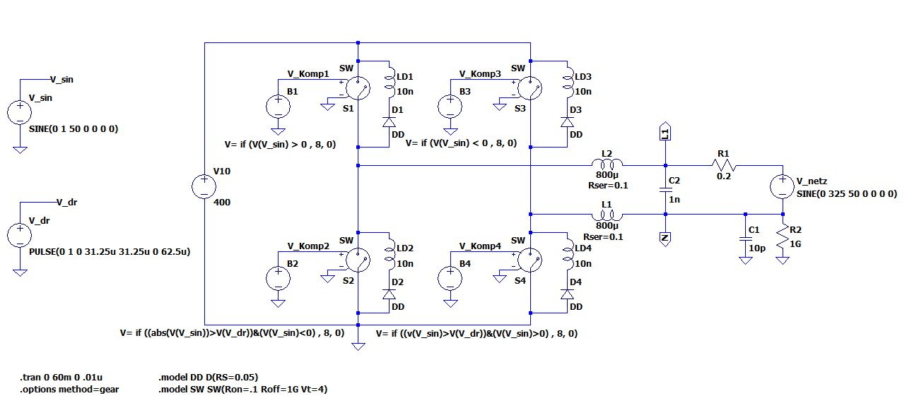 Hi, ich bin jetzt überfordert. Versuche das ganze im Rahme einer Simulation eines h 5 Inverters zu machen. Ansteuerung + Schaltung (siehe Screenshot). Mit LTSpice umzugehen fällt mir nicht leicht. Bin am überlegen es mit geckocir. zu machen. Aber es müsste ja auch mit LTSpice gehen.