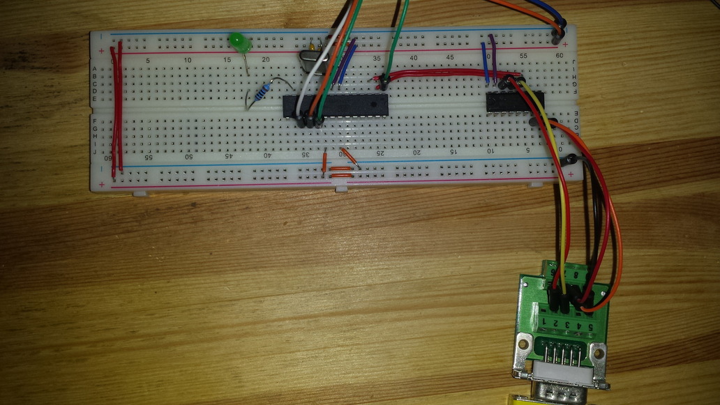Hallo Leute, Ich habe momentan ein riesiges Problem was mich regelrecht zur Verzweiflung bringt. Ich habe mit einem ATmega 8A-PU versucht eine Serielle Verbindung zum PC aufzubauen. Schaltplan (Foto) im Anhang. Das Problem ist, das am PC nur wirres Zeug ankommt (damit meine Ich): Ich sende das große "A" (65) zum PC und da angekommen ist es Hex FF (255). Das ist bei jedem Zeichen so was Ich versuche zu senden. Ein paar kleine Infos zu meinem Vorhaben: ATmega 8A-PU + 16 MHz Quartz (fnkt. auch!) Baudrate die Ich erreichen möchte ist 9600. MAX 232 ist auch zwischen Controller und PC. Mit der Formel die Ich hier gefunden habe (http://www.mikrocontroller.net/articles/AVR-Tutorial:_UART#Senden) errechne Ich einen Wert für das UBRRL Register von 103. UBRR = 16000000 / (16 * 9600) - 1 = 103,4.... (also 103 gerundet). Quellcode auch im Anhang. Sowie ein Screenshot von HTerm mit den falschen Daten (Serial-Monitor). Ich weiß Ich bin sicherlich nicht der einzigste mit soeinem Problem aber innerhalb 5 Minuten (Ja Ich habe gesucht aber kann sein das Ich was übersehen habe) habe Ich nichts passendes gefunden. Hat jemand eventuell einen 100% funktionierenden Schaltplan der die Grundlagen zeigt? liebe Grüße, Dominik