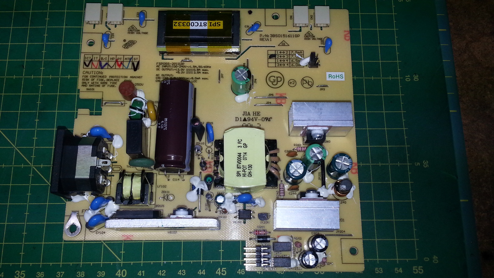 also kalte Lötstellen würde ich eher ausschließen, weil der Monitor "immer" kurz angeht und jedesmal nach exakt gleicher Zeit die Beleuchtung ausfällt. Beim Rest bin ich überfragt. Vielleicht hilft das Bild weiter.... hier hab ich was gefunden, inkl. Schaltpläne, aber zu hoch für mich http://linfotech.co.uk/schematics/Philips/Philips%20220VW8FB.pdf