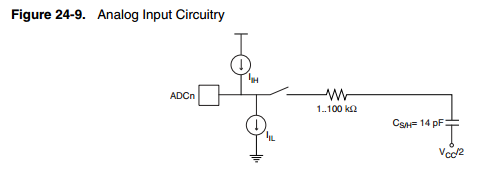 Es gibt auch nicht nur die 14 pF vom S&H Kondensator, sondern noch ein bisschen Kapazität vor dem Schalter, auch wenn das nur wenige pF sind. Der S&H Kondensator sollte schon relativ Konstant in der Kapazität sein - im Gegensatz zu Widerständen sind die Kondensatoren auf dem Chip recht präzise.