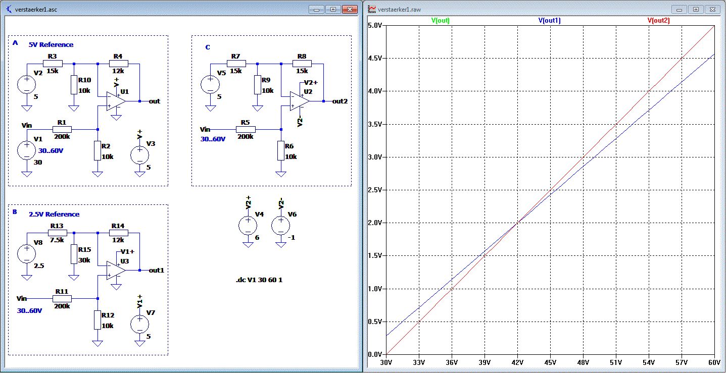Hier mal Beispiele. Variante A mit 5V Reference, Ausgang 0,286V...4,571V Variante B mit 2,5V Reference, Ausgang 0,286V...4,571V Variante C mit 5V Reference, Ausgang 0..5V Variante A und B erfordern einen Opamp mit Rail-Rail Ausgang, wenn nur 5V Versorgung verwendet wird. Als Opamp würde ein billiger TS912 reichen. Die Schaltung C erfordert eigentlich einen zusätzliche negative Versorgungsspannung und eine Versorgung >5V. Durch die Toleranzen des ADCs kannst du aber niemals 0V bis 5V zu 100% ausnützen. Wer will kann die Schaltung mit den angehängten Dateien mit LTspice simulieren. LTspice ist ein kostenloses SPICE-Programm von LTC. http://www.linear.com/designtools/software/#LTspice