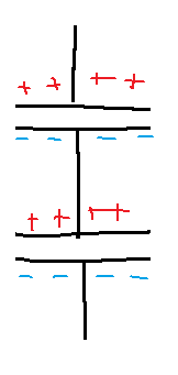 Ja schon, aber warum sollten die Elektronen im ersten Kondensator sich von den Löchern im zweiten, ganz weit entfernten Kondensator mehr angezogen fühlen, als von den Löchern, die ihnen direkt gegenüber liegen?