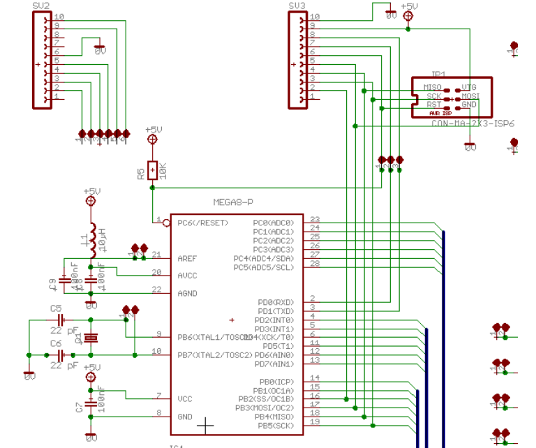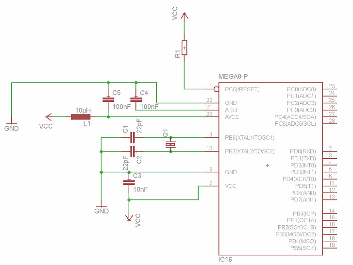 kopfkratz Benutzt Du den ADC ? Wo gehen denn die restlichen Ports hin, ansonsten ist das die Grundschaltung für Mega8 mit ADC und externem Quarz. Die beiden Fauxpax wurden ja schon genannt. Das sind die Grundlagen, also was willst Du schalten und verwalten ? Hast Du einen POTI den Du auswertest um z.B. eine LED zu dimmen oder hängt ein Motor dran oder ein Piezosummer ? Was hast Du an Dein MK2 Board drangehängt und was macht Dein Programm eigentlich ?
