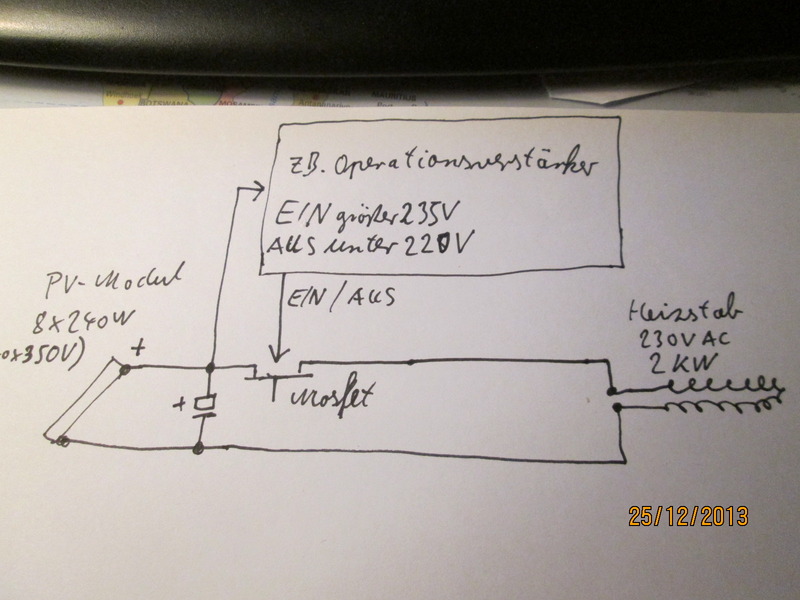 Hallo GR0907, Wenn Du schon so weit bist, dann ist es ja nicht mehr weit DiE MOSFETS mit PWM anzusteuern und die Last kontinuierlich an das vorhandene Leistungsangebot anzupassen. Ich habe seit ein paar Wochen eine Anlage im Betrieb mit 3 Strings zu je sechs Modulen. Die MPP Spannung liegt bei 230 Volt. Als Heizstab habe ich auch einen 2kw Heizkörper mit 3 Elementen. Für die Abschaltung habe ich in jedem String ein Relais, das Im Notfall die Panels kurzschließt. Im Moment mache ich die Leistungsanpassung noch mit 3 Schaltern von Hand, aber ich arbeite an einer Schaltung wie oben beschrieben, mit einem Speicherkondensator einem Komparator und Mosfet zum schalten. Leider fehlt es mir an den Microcontroler Kenntnissen um einen MPP Tracker zu programmieren. Seit Ende März ist meine Ölheizung kaum noch angelaufen um Waser zu erwärmen. An sehr sonnigen Tagen erwarte ich aber im Somer ein Überangebot an Energie. Ich hatte schon maximaltemperaturen gegen 80 Grad C. Mal sehen wie ich damit umgehe. Ich würde mich über Erfahrungsaustausch freuen. Grüße HT