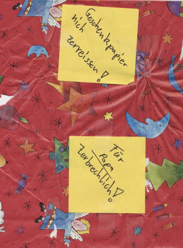 Immer wieder lustig, wie bei jeder Gelegenheit die kleinen Misanthropen und lebensunzufriedenen Nörgelheimer aus ihren mentalen Kellern gekrochen kommen. :-D Ich habe vom Großen (10J.) eine Plastik-Armbanduhr geschenkt bekommen (damit ich nicht immer erst umständlich das Mobiltelefon aus der Hosentasche angeln muss), schön verpackt mit dem Hinweis, das Papier bitte nicht zu zerreißen. Siehe Anhang. :-) Bedauernswert sind meiner unmaßgeblichen Meinung nach diejenigen, die etwas Derartiges entweder nie erleben durften oder dem nichts abgewinnen können. /Hannes