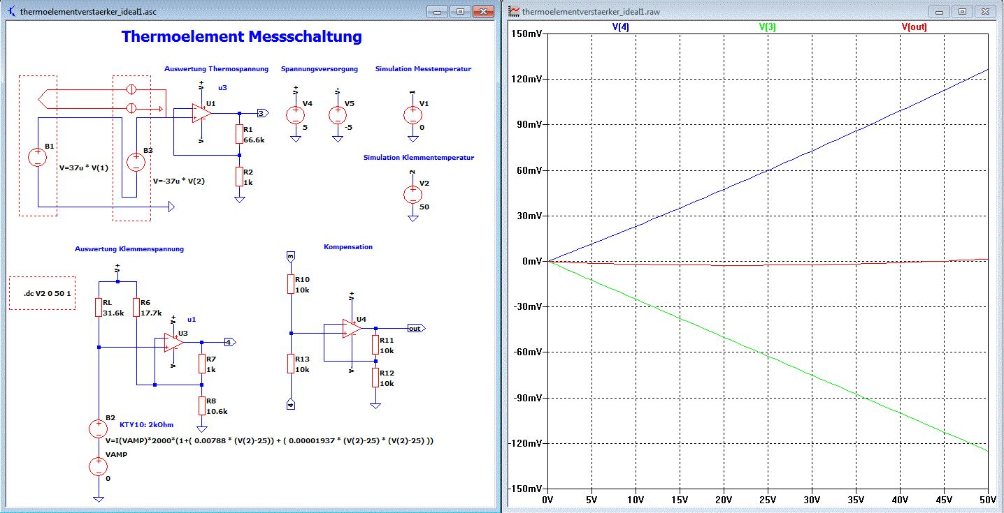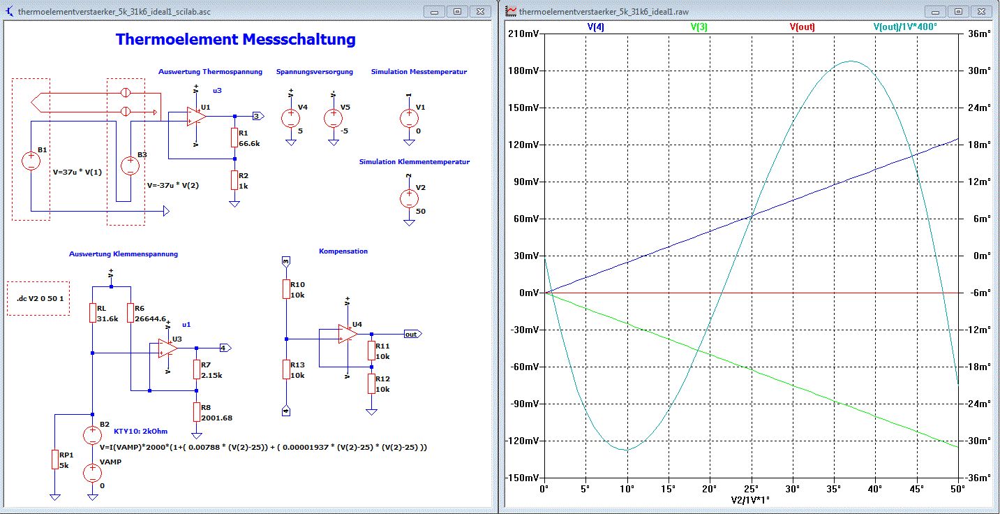 Die Ausgangsspannung V(out) muss unabhängig von der Klemmentemperatur werden. Dazu muss der Verstärker für die Klemmentemperatur richtig dimensioniert werden. Nachtrag: Mann kann auch ° plotten. Siehe Bild.