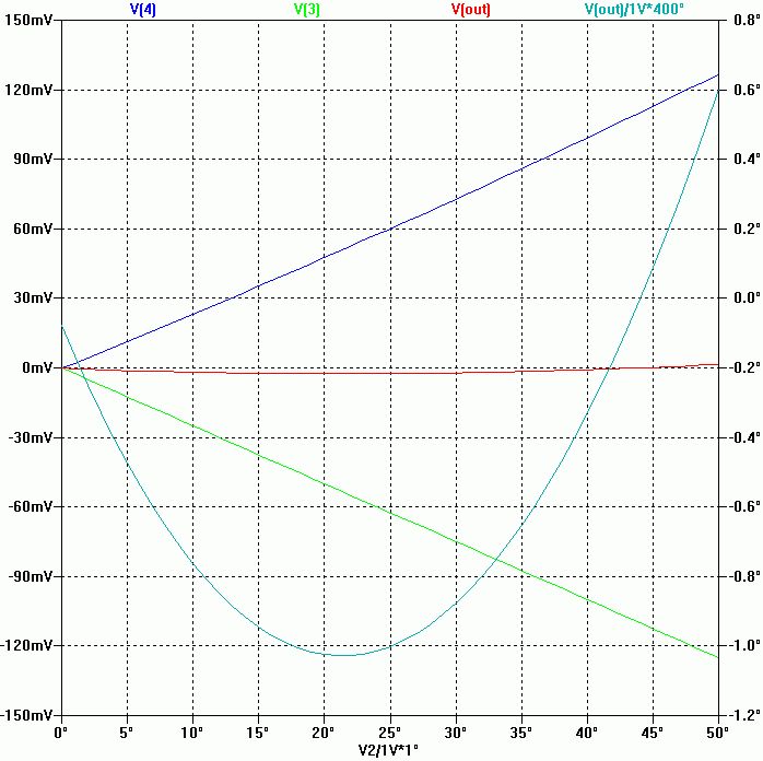 Nimm meine letzte Schaltung inclusive dem Plotfile(.plt). Wähle RL z. B. 20kOhm. RUN V(4)(blau) wird jetzt zu steil sein. deshalb ist die Summe V(out)(rot) ansteigend. 1. Erhöhe/erniedrige R8 bis die rote Kurve ganz flach ist. 2. Die rote Kurve beginnt jetzt aber nicht bei 0V so wie es sein soll. Deshalb erniedrige R6 bis die rote Kurve bei 0V beginnt, Jetzt wird sie aber nicht mehr ganz flach sein. Gehe zu 1. und wiederhole 1 und 2 so lange bis dir das Ganze gut genug ist (rote Kurve flach genug und durch 0V).