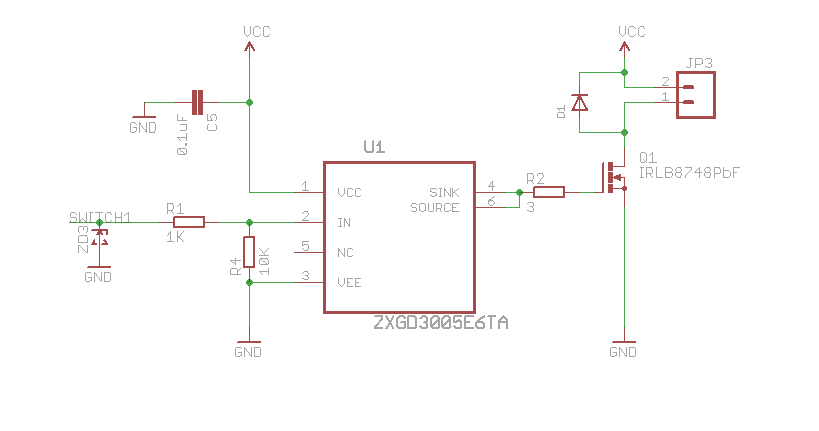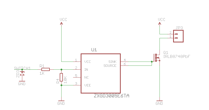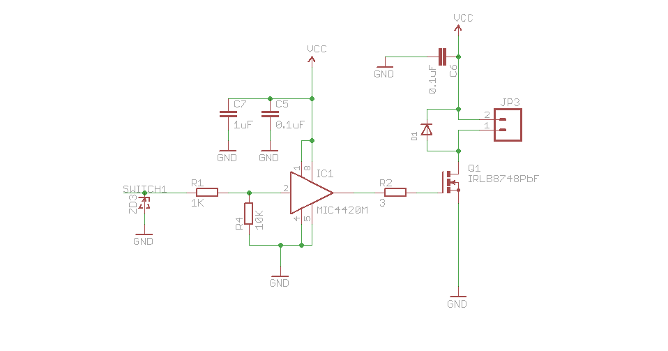 Und ein Kondensator (Keramik + Elko zb) von Vcc nach GND wäre auch nicht schlecht. Um die Induktivität in der Schleife Vcc->Diode->MosFet->GND->Kondensator->Vcc klein zu halten. (Dh. MosFet + Diode + Kondensator nahe beieinander aufbauen) Und Gatevorwiderstände wären auch cool. Größenordnung 2-3 Ohm Davon abgesehen brauchst du sicher keinen 10A Gatetreiber bei so einem kleinen Mosfet. Es sei denn du hast den gerade zur Hand.