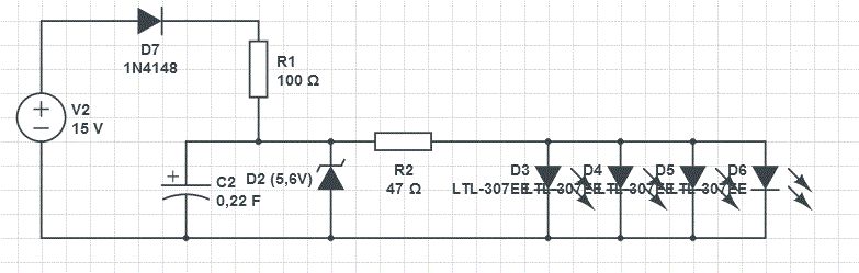 Danke für deine Mühe! Kannst du mir die Schaltung mal grob erklären? Was machen die 470nF Kondensatoren? Und wozu ist die Spule? Die Z-Diode hat 6,2 Volt, wenn ich das richtig aus dem Namen lese?! Damit sind das aber 0,7 Volt mehr als der Goldcap verträgt oder ist das im Rahmen der Toleranz so in Ordnung? Die 4 LEDs brauchen zusammen aber doch deutlich mehr als 6,2 Volt, wie funktioniert das denn genau?