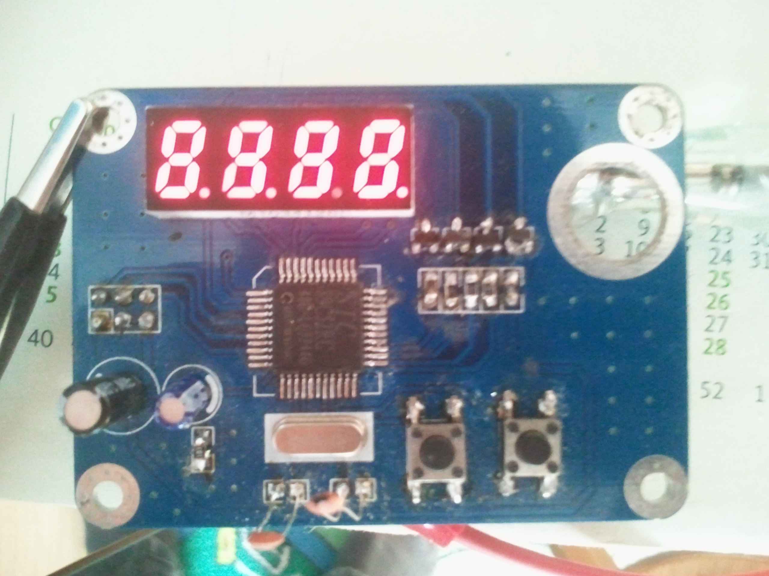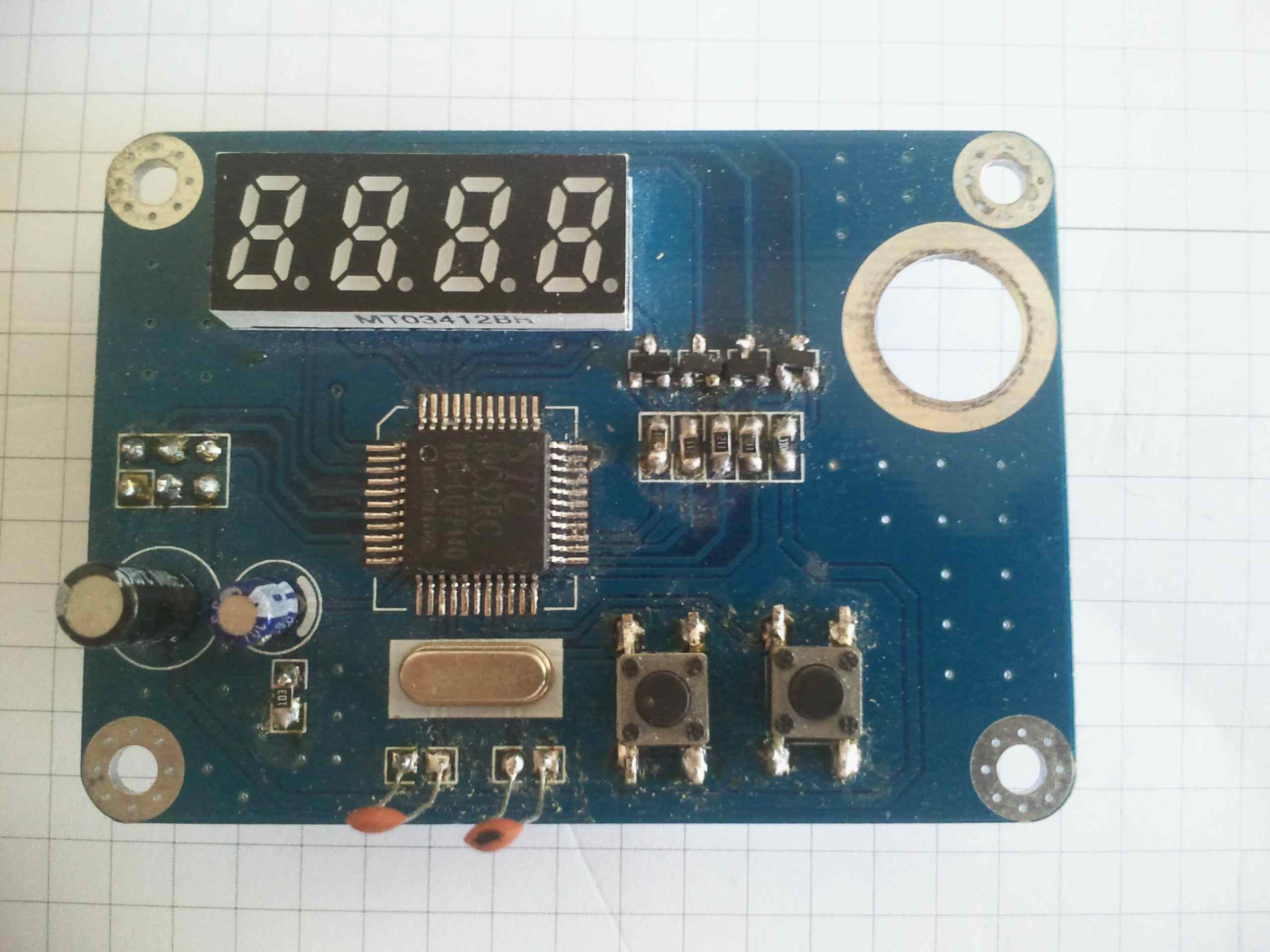Hallo, ich habe hier einen Funktionsgenerator (obere Platine) auf der man normalerweise mit zwei Tastern die Frequenz einstellen. Linker Taster für UP und rechter für DOWN. Es funktioniert anscheinend nur der rechte. Das zweite problem ist, das die Anzeige nicht richtig funktioniert. Es leuchtet alles irgendwie durcheinander. Wenn ich die UP Taste drücke, wird im Hintergrund angezeigt (kann man leicht erkennen): 1111;2222;3333;4444;5555;6666;7777;8888;9999;0000; ... und immer so weiter. Da ich keinen Schaltplan habe, nur Bestückungssplan, habe ich jetzt mal grob den Schaltplan gezeichnet. Die Schaltung sieht zwar schlecht gelötet aus, habe sie aber auf Kurzschlüsse durchgemssen. Das komische ist auch, wenn ich beim Quarz beide Beinchen miteineander verbinde zeigt mir die Anzeige eigentlich eine einwandfreie Zahl an (aber nicht das was es soll), nur lässt sich mit den Tastern nichts machen. Der Rechte Taster geht auch irgendwie nicht. Weiss da einer von euch weiter?