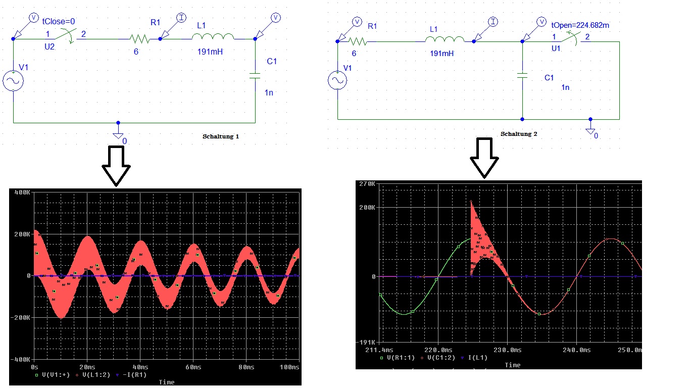 Hallo, gegeben seien die beiden obigen Schaltungen (siehe Bild). Beide Schaltungen sollen das transiente Verhalten eines Leistungsschalters simulieren nach einem Erdschluss. -Schaltung 2: Hier wird dies besonders deutlich. Erst liegt ein Erdschluss vor und der Schalter (Leistungsschalter) ist geschlossen. Dann öffnet der Schalter im Strom-Nulldurchgang: