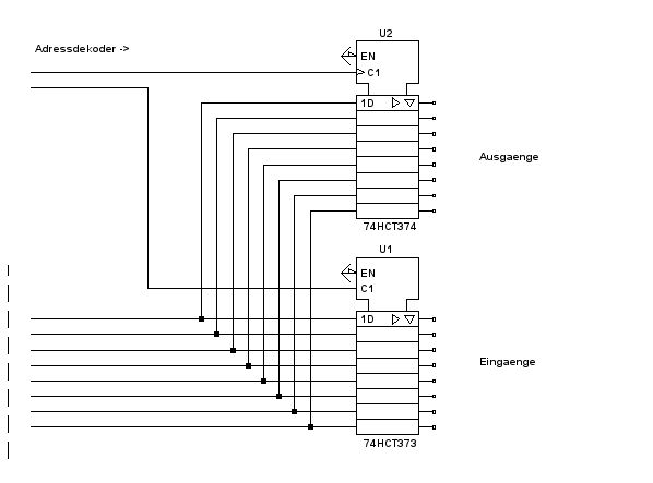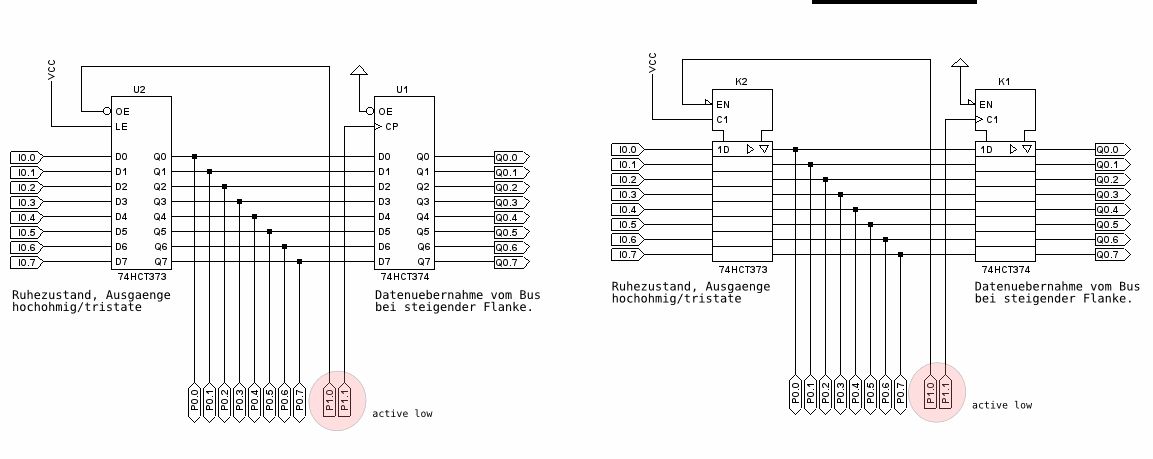 >> an die entsprechenden Pins. Also Q0 bis Q7 bzw. D0 bis D7. > 373 vorzugsweise als "Ausgang" > 374 vorzugsweise als "Eingang" Sorry, anders herum! Zu lange her.
