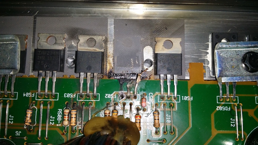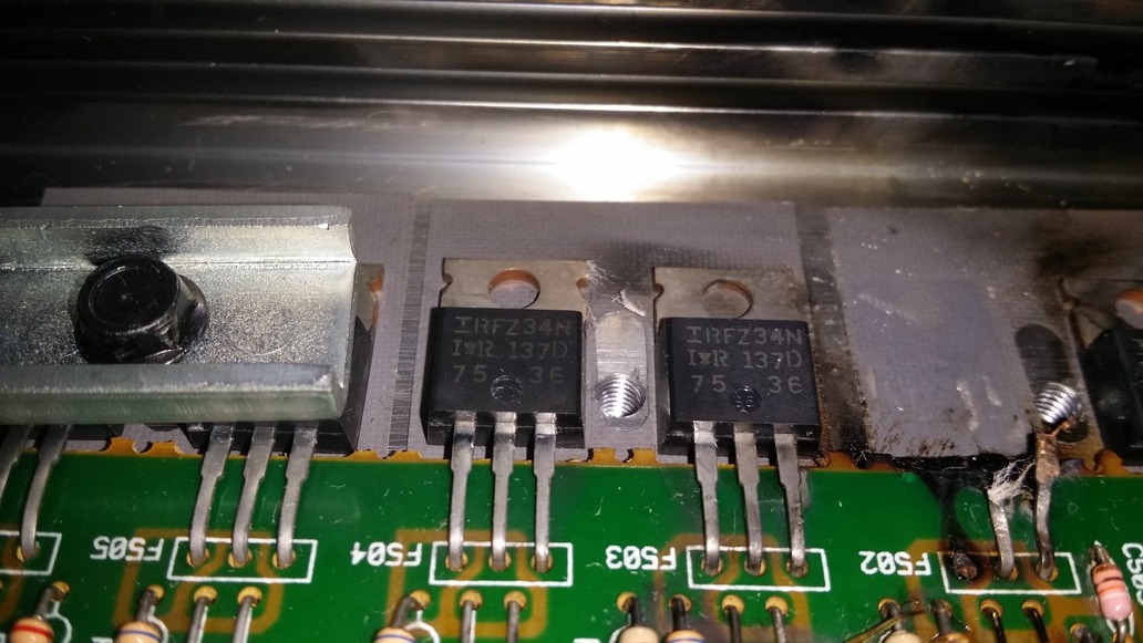 Guten Abend alle zusammen. Ein Kollege bat mich seine Endstufe zu überprüfen, da sie nicht mehr läuft. Ich habe das Gehäuse geöffnet und festgestellt das einige Mosfet`s durchgebrannt sind. Desweiteren viel mir auf das die Kondensatoren leicht gebläht sind und bei zwei Dioden die Platine verfärbt ist. Ich habe bis jetz verzweifelt nach diesen Mosfets (Transistoren) gesucht, (Conrad und Co. half nicht). Hat einer eine Idee wo man diese beziehen kann? Meint ihr das die Elkos auch platt sind und evtl. auch die Dioden?? Und wenn ja, wo bekomm ich die her? Die Elkos sind keine 2 cm hoch (35v 3300µF 85°C) Ich hoffe die angehängten Fotos reichen zur Identifizierung