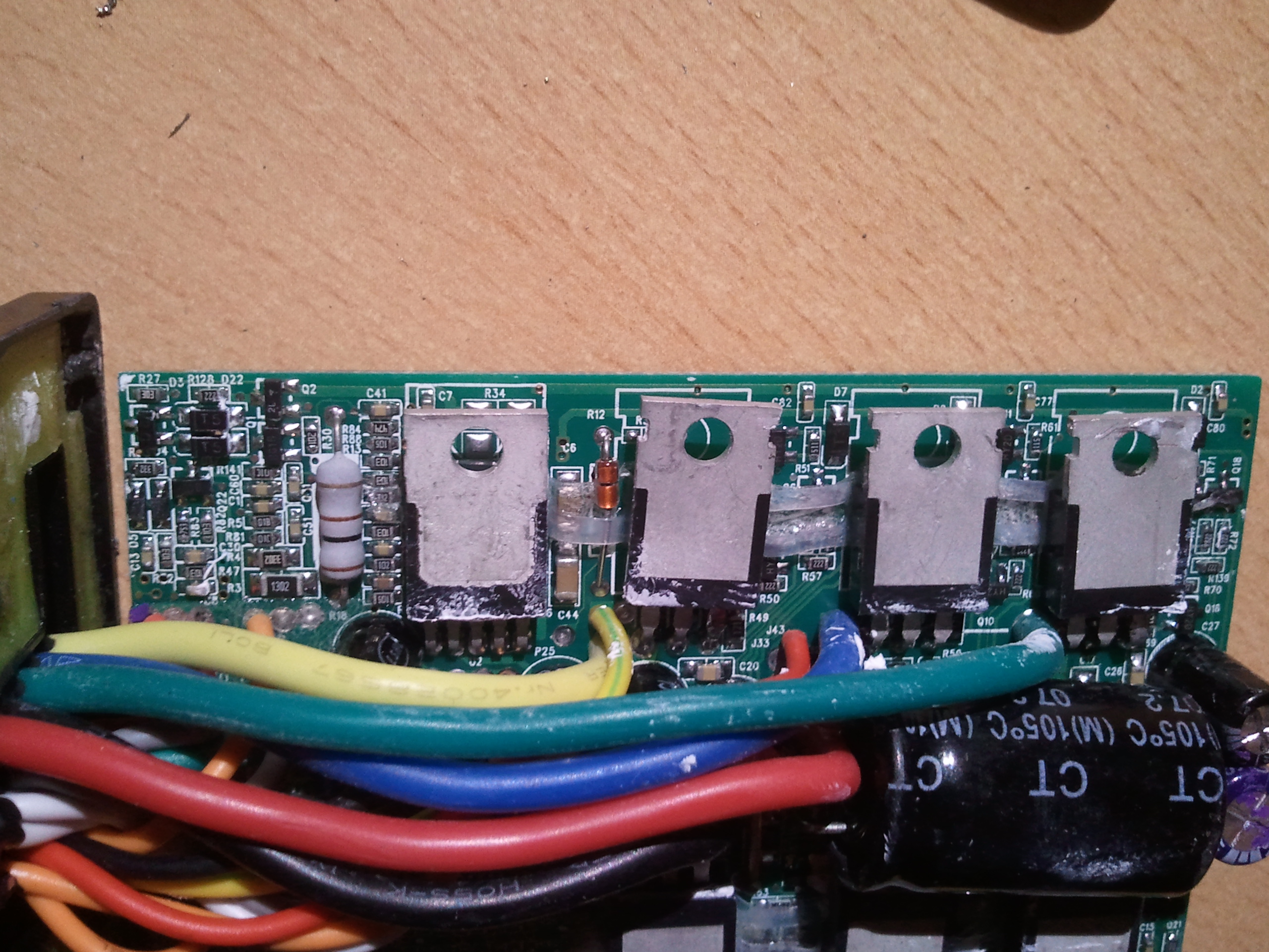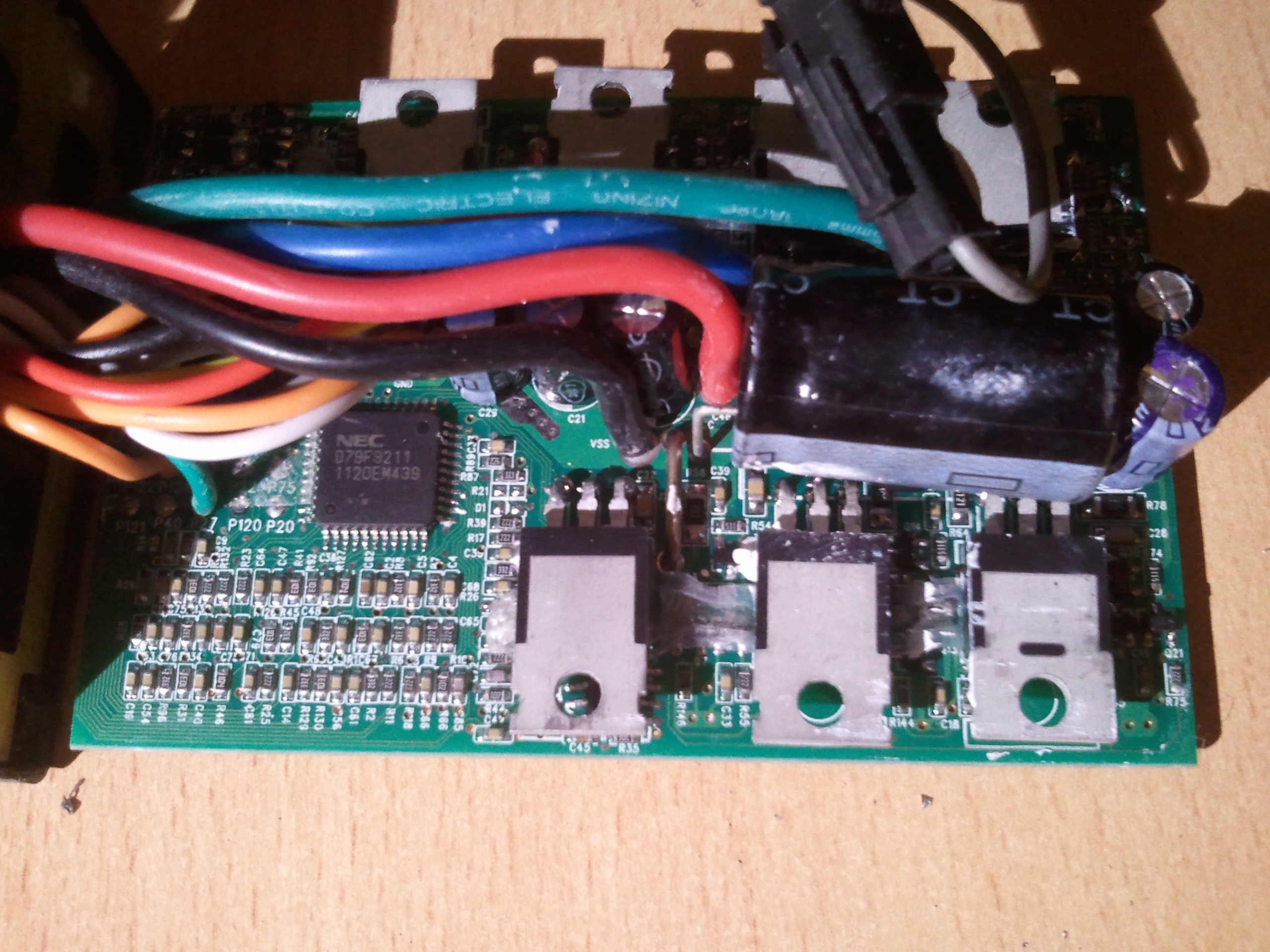 hi, anbei die Bilder, sieht eigentlich alles gut aus... hab nun wieder die intakte alte mosfets verbaut, aber immer noch das selbe problem. es scheint auch wirklich der strom zu sein, da ich bei leichter beschleunigung kein problem bekomme, nur wen ich mehr gas gebe, geht er aus. könnte es auch sein, das der motor defekt ist? wie messe ich dem am besten durch? es sind neben den 3 phasen auch noch ein 3 poliger stecker und ein 2 poliger zum motor vorhanden...