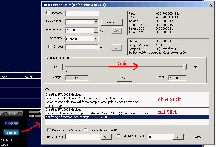 Hallo Helge Wenn du auf ExtIO drückst, dann muss oben bei Device Hint "RTL" erscheinen. Falls nicht, kannst du mal RTL reinschreiben und auf Create clicken. Was erscheint im Log Fenster? Hat HDSDR den Stick erkannt? Hast du Gain mal auf max. aufgedreht? Was zeigt