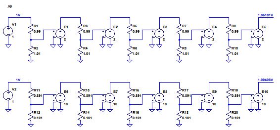 Hier mal zwei Beispiele für Fehlerfortpflanzung mit je 10 Widerständen und +/-1% Toleranz. Einmal entsteht aus +/-1% Tolerant 5% Fehler und im zweiten Fall 9,4% Fehler. Soweit ist das von 10*1% nicht weg.