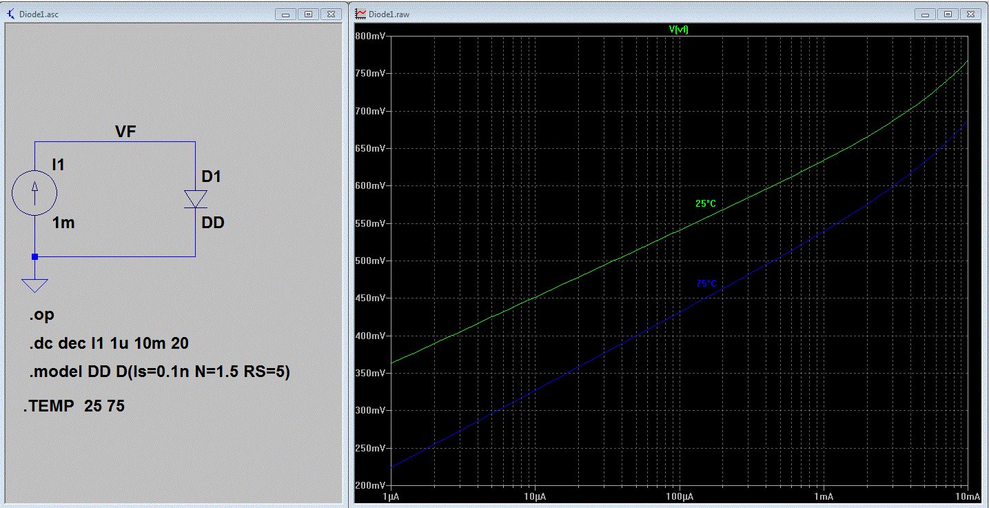 Hier mal ein Beispiel mit .TEMP bei 0 und 50°. Mit steigender Temperatur gibt eine kleinere Spannung. Die Diode DD habe ich mit N=1.5 auf eine eher echte Diode angepasst. Du solltest du den 470k am Eingang auf z. B. 10k..47k reduzieren wegen den Leckströmen die bei kleiner Amplitude und höherer Temperatur das Signal begrenzen.