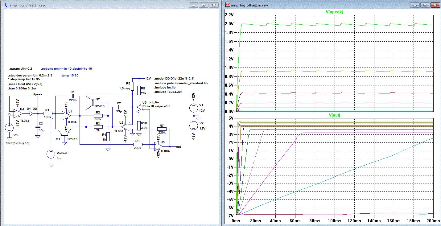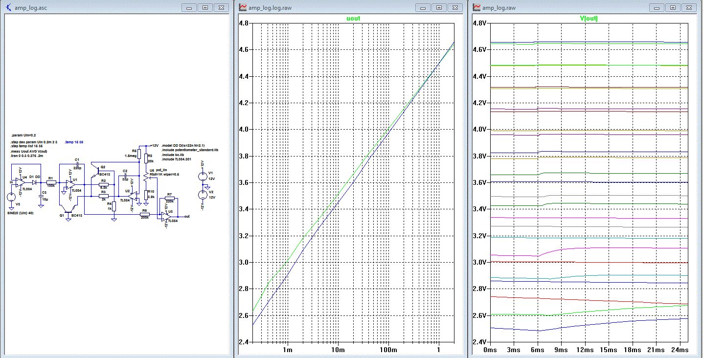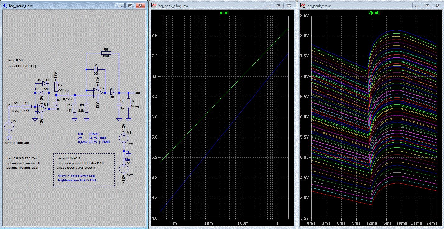 Hallo, wie bringe ich LTSpice bei, dass ich nicht den zeitlichen Verlauf der Spannungen sehen will, sondern die Abhängigkeit Uout=f(Uin)? (Wobei Uin eine Wechselspannung, Uout eine Gleichspannung ist.) S. Anhang (das funktioniert auch praktisch schon - wer sagt da immer, logarithmierende Schaltungen mit ausreichender Genauigkeit wären ein Riesenaufwand)? ;) Ausgangspunkt war die Schaltung hier: http://www.elexs.de/messen6.html (Kleiner Fehler: Die Spannung über der "Temperaturkompensations" - Diode wird nicht von der Ausgangsspannung subtrahiert, sondern dazuaddiert, aber das spielt hier keine Rolle, hier interessieren bis zum Gleichrichter eh' nur Wechselgrößen - das Ganze sitzt in einer Aussteuerungsanzeige.)
