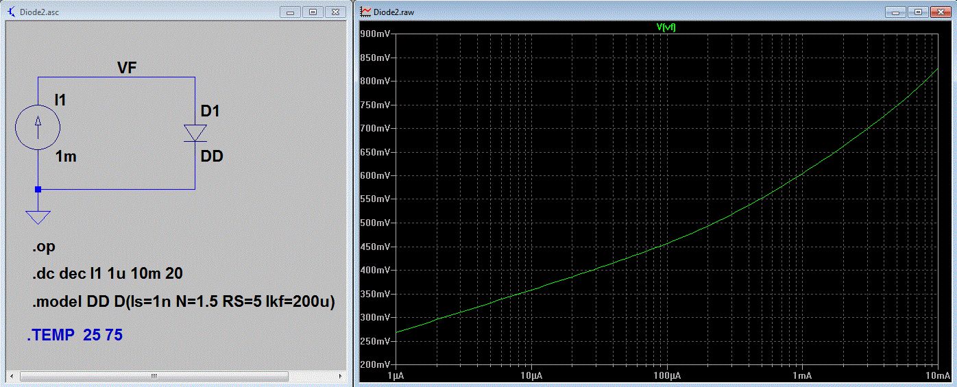 Nimm eine logarithmische x-Achse. N ist die Steigung der Gerade bei kleinen Strömen I<1mA Is ergibt den vertikalen Versatz der Gerade bei kleinen Strömen I<1mA ( Ikf falls du einen Bereich siehst der die doppelte Steigung hat (hier ab 200uA. Oftmals sieht man den Bereich nicht. ) Rs für die Rundung nach oben bei Strömen >1(10)mA .model DD D(Is=1n N=1.5 Ikf=200u RS=5) Wie man sieht ist das alles ganz einfach. Nachtrag: Die Werte N und Is kannst du aus zwei Punkten ausgehend von dieser Formel berechnen. Nimm zwei Messpunkte bei kleinen Strömen: 1uA, 100uA Id1 = Is*e^(Ud1/(N*Ut)) Id2 = Is*e^(Ud2/(N*Ut)) Id1/Id2 = e^(Ud1/(N*Ut))/e^(Ud2/(N*Ut)) ln(Id1/Id2) = (Ud1/(N*Ut)) - (Ud2/(N*Ut)) ln(Id1/Id2) = (Ud1-Ud2)/(N*Ut)) N = (Ud1-Ud2)/(Ut*ln(Id1/Id2)) Ut = k*T/e Nachdem du N hast, Is = Id1/e^(Ud1/(N*Ut))