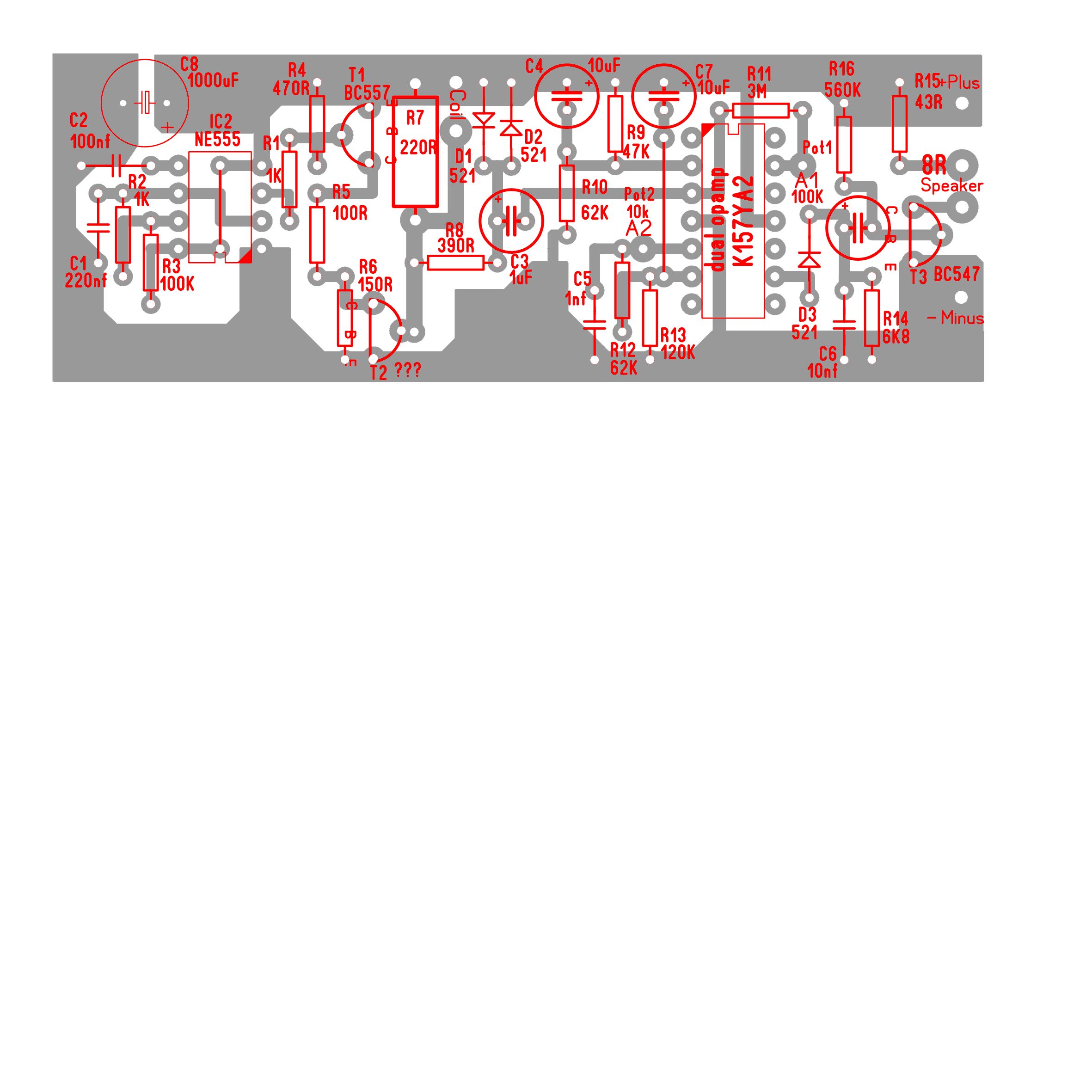 Zumal das wohl irgendein Sound-Effekt-Modul ist bei dem es vor allem auf Dreckeffekte ankommt. Nicht ohne Grund wird man die Frequenzkompensation des OpAmps unangeschlossen gelassen haben und mit einem Gain von 3000 und als Komparator massiv in die Übersteuerung gehen, die dann wieder mit Dioden geclippt werden und an einen Lautsprecher der durch einpolige Ansteuerung nur zu einer Seite auslenkt, dafür aber mit extrem schlechtem Dämpfungsfaktor betrieben wird. Will man genau denselben Sound, bleibt nur das Original zu kaufen. Bei der Schaltung würde ich aber sagen: Klingt auch dann Scheisse.