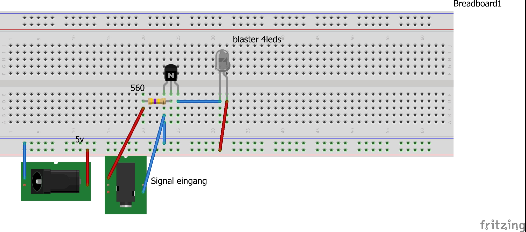 Das sind ja IR-LEDs, oder? An jeder dieser LED müssen ca. 1,2-1,5V stehen, damit sie leuchten und am Transistor fallen schon mal 0,7V ab. Bleiben 5,3V für die LED. Um genügend Reserve im Strom zu haben (und für den unbedingt notwendigen Vorwiderstand) schaltest du also je 2 IR LED in Reihe mit einem Vorwiderstand und führst beide Ketten an den Kollektor des BC547. Jetzt lass uns den nötigen Vorwiderstand berechnen: R = U/I, wir setzen U mit 5,3V - 2,6V (die Spannung für die LEDs) an, ergibt 2,7 V. Für anständiges Leuchten kann man den LED ruhig mal 25-40mA verpassen. Wenn das gepulst wird, gehen auch mal 80mA. Allerdings mag der BC547 nicht mehr als 100mA. Also für 40mA pro Kette: R= 2,7/0,04 = 67,5 Ohm. Der nächste Normwert sind 68 Ohm. Die Schaltung sieht dann so aus: +6V o--------------+----+ | | -- -- 2 * IR LED \/ \/ -- -- | | -- -- 2* IR LED \/ \/ -- -- | | -- -- || || 2 * 68R || || -- -- | | +----+ C | Jack 2k2 / o--|==|-+---- | BC547 (besser BC337) | B | -- \ E 1k || | || | -- | GND | | o-------+------+ Das Eingangsnetzwerk 2k2/1k schaltet die LED sicher ab, solange der Klinkenausgang noch kein Ausgang ist.