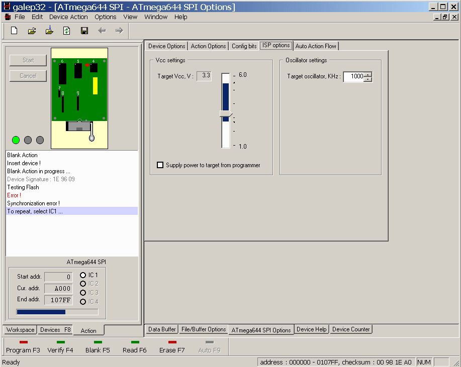 Der GALEP IV liefert mir beim Programmieren über ISP-6pol. eines ATMega644 die obige Fehlermeldung und bricht dann ab. Diese Verhalten tritt mit einmal auf. Der Chip wurde bis jetzt 100 x oder so einwandfrei programmiert. Der Fehler tritt auf: - während "Program" immer an der Position 0x477A - während "Blank" immer an der Position 0xA000 (siehe Anhang) Kennt jemand das Phänomen? Woran kann das liegen?