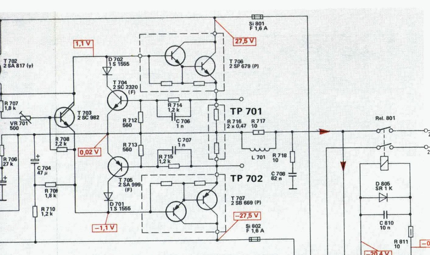 Felix W. schrieb: > Ich hätte eben gedacht, dass die Endstufe auch durch zu laues Aufrehen > und so überlastet und damit die Transistoren kaputt gemacht wurden. Das sollte eine Endstufe aushalten. Aber mancher Billigkrams übersteht nicht mal das. Immerhin hat deine Endstufe einen kurzschlusschutz. > Da es sich bei solchen Tranistoren ja eh nur um Centbeträge handelt, > würde ich sie halt gleich alle austauschen, die Frage ist ja eigl. nur, > was noch... Nach dem Austauschen der Transistoren muss du mit VR701 den Ruhestrom einstellen. Da ist es gut, wenn beim Stereo-Verstärker die andere Seite noch funktioniert und nicht getauscht wurde, denn dann kann man dort den Stollstrom (Spannungsabfall über R716) nachmessen. > Die Wiederstände schreiben sich auch nach neuer Rechtschreibreform Widerstände > im Anhang hab ich eigentlich alle geprüft, bei 4 kommt > ein wesentlich geringererer Wert raus, allerdings ist das ja vl. > Schaltungsbedingt? Man muss sie natürlich ausbauen, also ein Ende ablöten, wenn man sie korrekt messen will. Man sollte eigentlich die originalen Transistor-Typen wieder einbauen, aber wenn die Beschaffung sehr schwer ist 2SB669 = BD264A = BD700 = BD648 = BD900 = BD902 2SD679 = BD265A = BD647 = BD699 = BD899 = BD901 2SC2320 in deinem Fall BC547 o.ä. haben andere Anschlussbelegung 2SA999 in deinem Fall BC557 o.ä. haben andere Anschlussbelegung 1S1555 = 1N4148