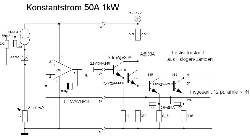 Ich habe den Beitrag erst jetzt gelesen - inzwischen hat sich das Thema ja wohl erledigt. Die ursprüngliche Frage war ja eine Stromsenke für den kW-Bereich. Dazu habe ich hier eine QuickAndDirty-Lösung: Stromkonstanter mit 50A 1kW, beliebig ausbaubar. Den habe ich gebraucht, um aus mehreren defekten Sätzen Transaktionsbatterien für Hebebühnen einen funktionierenden Satz zusammenzusetzen. Ein Satz bestand aus 4 Einzelakkus mit 6V 220Ah. Da ich die Stromquelle wohl so schnell nicht wieder brauche, habe ich alles aus vorhandenen Teilen prototypenmäßig zusammengebaut. Die Transistoren (Typ unbekannt) sind aus einem alten Großrechnernetzteil. Es sind auf jedem Kühlblech 3 Transistoren mit je 0,15 Ohm Emitterwiderständen aufgebaut. Davon habe ich 4 parallel geschaltet - also 12 parallele Transistoren. Der gesamte Kühlklotz sitzt in einer Pappkiste zur Luftführung des Lüfters. Um mehr Leistung verbraten zu können, ist im Kollektor ein Vorwiderstand aus 18 Stck 12V-50W-Halogenlampen z.B. als 9p2s geschaltet. Ich habe meistens einen kompletten Satz Akkus mit 24V entladen. Zum Laden musste mein Schutzgasschweißgerät herhalten. Die Spg habe ich direkt vom Gleichrichter mit einem Starthilfekabel abgenommen. Strom und Spg haben genau gepasst. Ein bisschen abenteuerlich war es schon...