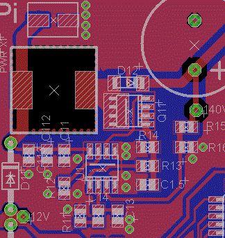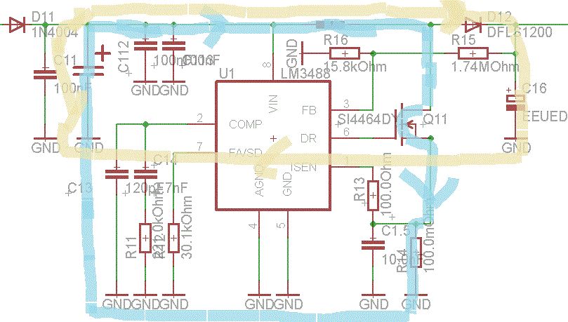 Hi Leute, brauch eure Hilfe bei einem Schaltregler. Meine Aufgabe ist es aus 12V eine Spannung von 140V zu erzeugen bei einem max. Strom von 30mA. Der Schaltplan ist erstellt, die Platine gelayoutet und schon bestückt. Leider oszilliert der Regler nicht und schaltet den MOSFET dauernd durch. Der Schaltplan würde mit dem Tool „Webench“ von TexasInstrument erstellt. Das Ergebnis kann in der PDF-Datei „TI-Webech“ angeschaut werden. Trozdem hier schonmal ein paar Informationen: - Regler: LM3488MM/NOPB von TI - Mosfet: SI4464DY-E3 von Vishay-Siliconix - Spule: SRR1260-102K von Bourns - Diode: DFLS1200-7 Da leider im Datenblatt (auch angefügt) kein PCB-Vorlage war musste ich selber ein Layout erstellen. Und ich glaub das ist mir auch ganz gut gelungen? Der Ausschnitt von der Platine ist ebenfalls angefügt. Kleine Veränderungen hab ich jedoch zu dem Schaltplan gemacht! Da beiden Eingangskondensatoren (EMVY160ADA220ME55G mit 22uF und einen standard-Kondensator 100nF) auf dem PCB durch die Spule getrennt (kleiner Stromschleife) ist, hab ich den 100nF durch zwei weitere ergänzt und bilden jetzt ein Array vor den Regler (siehe Layout). Es ist leider ein kleiner FEHLER unterlaufen!!! Der Regler hat einen falschen Footprint! SO8 satt MSO8!!! Die Beinchen würde vorsichtig auseinander gebogen und und mit etwas mehr Lötpaste im Reflowofen gelötet. → Was für negative Effekte kann das haben? Anschließen unter einem Mikroskop auf ungewollte Kurzschlüsse untersucht sowie mit einem Multimeter. Ein Foto des Platinenausschnitt sowie vom Regler werde ich auch hochgeladen. Bedauerlich musste ich beim ersten Testen feststellen das der DC-DC-Wandler nicht funktioniert. Das erste Anzeichen war, dass das Labornetzteil in Strombegrenzung ging. Mit einer Wärmebildkamera war dann sehr schnell klar warum, der MOSFET ist die ganze Zeit durchgeschaltet. Hat einer von euch eine Idee, warum der Regler kein PWM-Signal ausgibt? Den Mosfet hab ich nicht runter gelötet, um zu schauen ob der Regler danach sauber arbeitet. Fällt jemanden noch andere Tests ein, die man noch durchführen sollte? Vl. hat schon jemand mit der Serie gearbeitet und kann mir die Unterschiede von den Regler erklären: Sind das nur die Bezeichnungen für das Gehäuse vom Chip? LM3488MM LM3488MMX LM3488QMM LM3488QMMX Vielen Dank schon mal für eure Hilfe Gruß Fred
